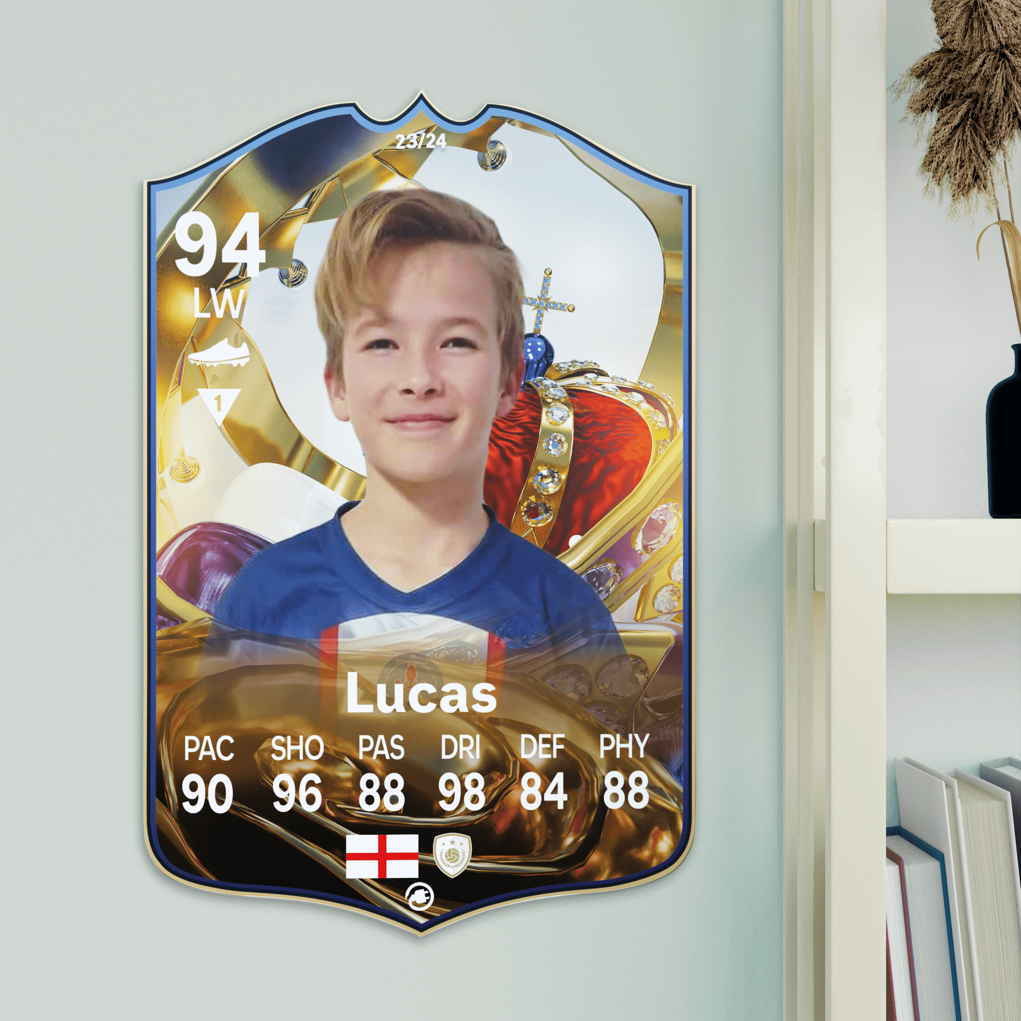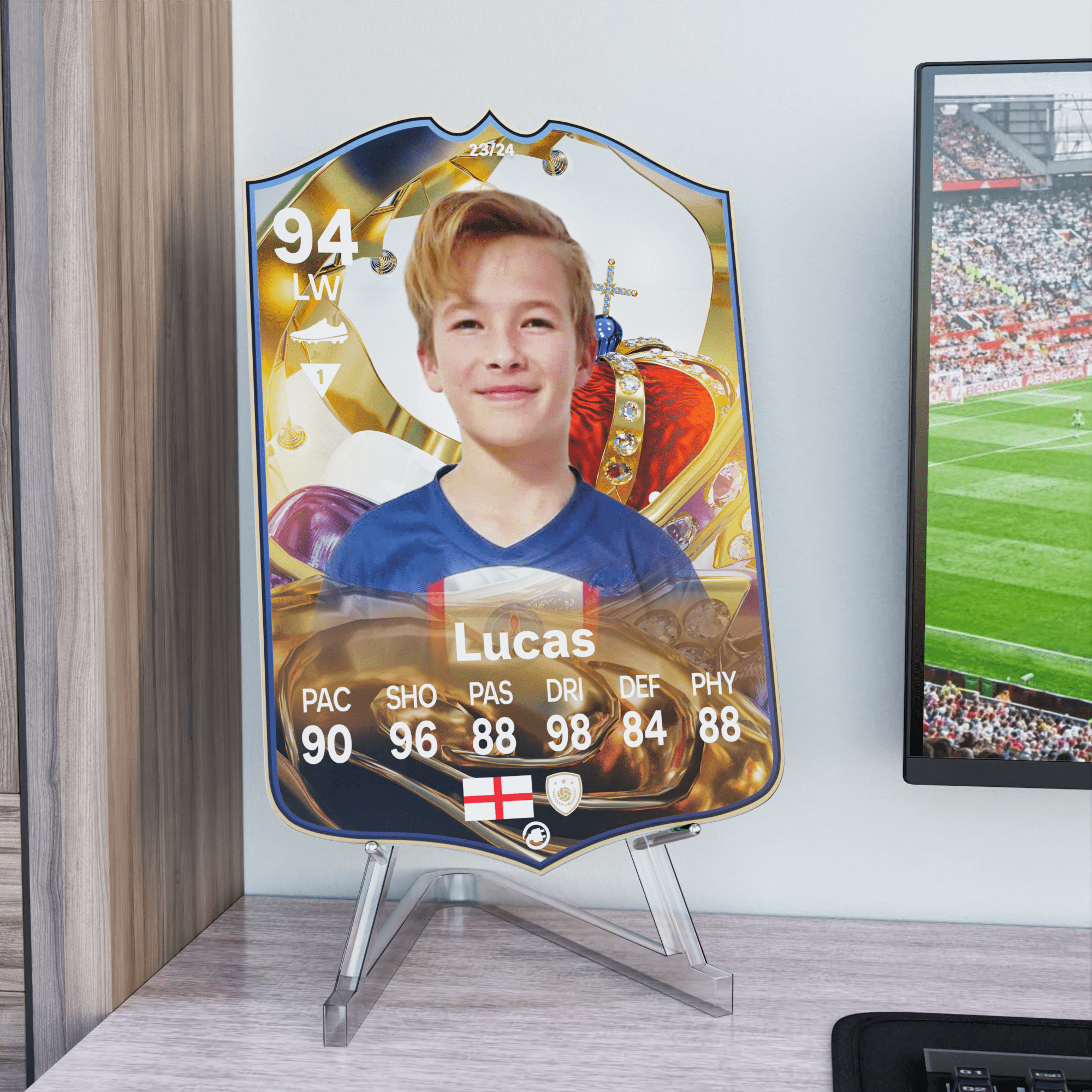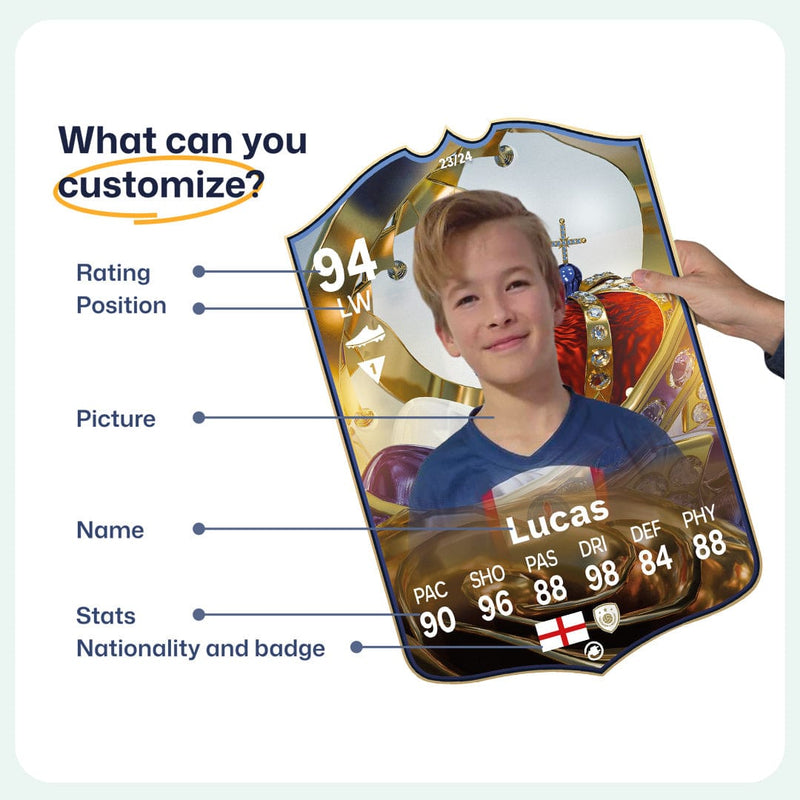 When it comes to personalising your card, the basic steps are to upload a photo and add a name to your card. Then you’ll add details like your player’s position and skill ratings out of 99 for each football skill shown on the card. Our online card builder makes this really easy. And if you aren’t a football card expert, don’t worry!