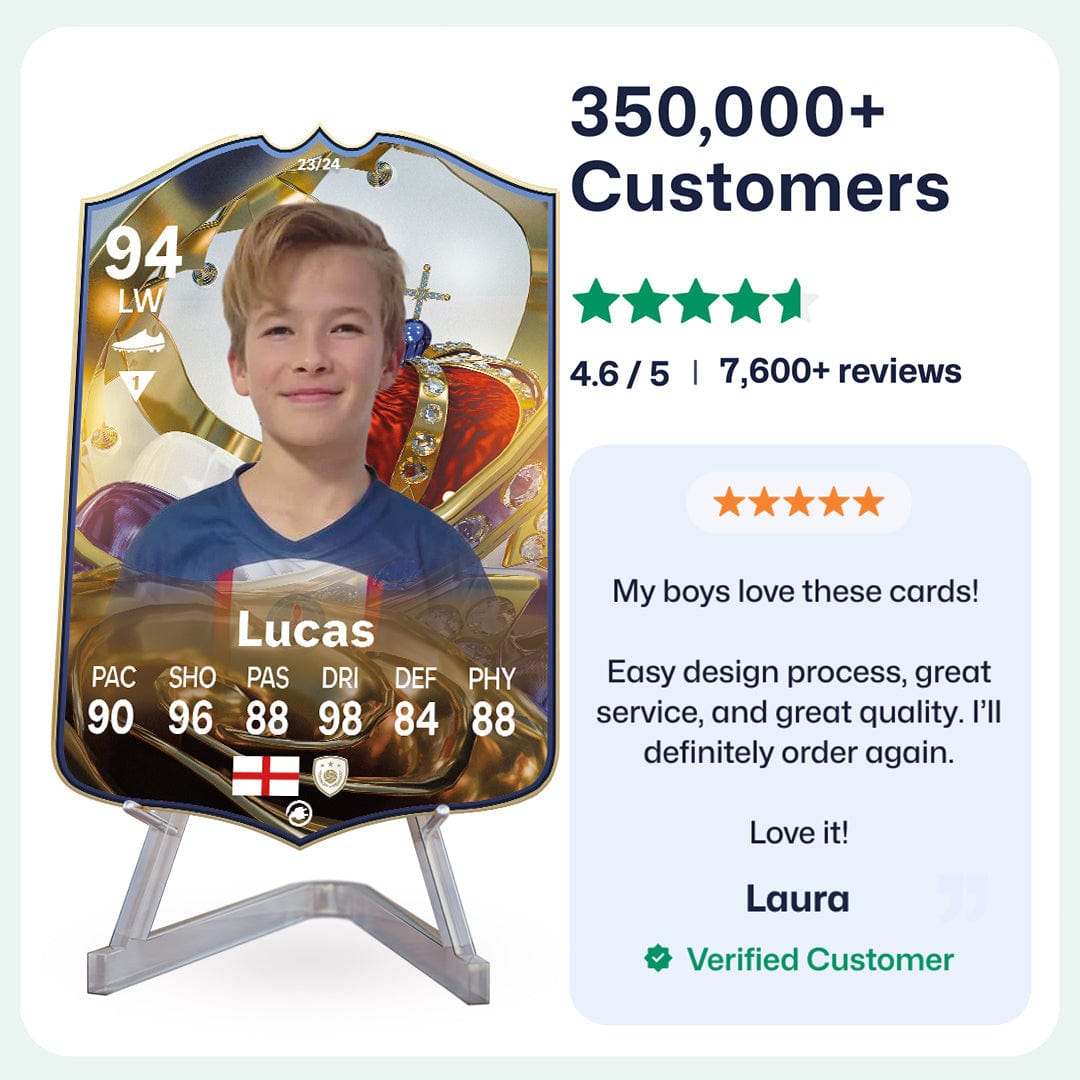 Yes! Our football card designers will remove the background from the photo you upload so it looks just like the football cards you might’ve seen games like EA FC 25, EA FC 24 or FIFA. We’ll also position the photo perfectly on the football card so it looks great. If there are any problems with the quality of your photo, we’ll reach out and let you know. Plus, our website's AI will remove the background on the image for visual purposes before purchase so you can see it without a background on the card.