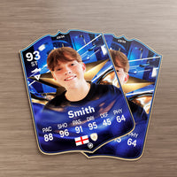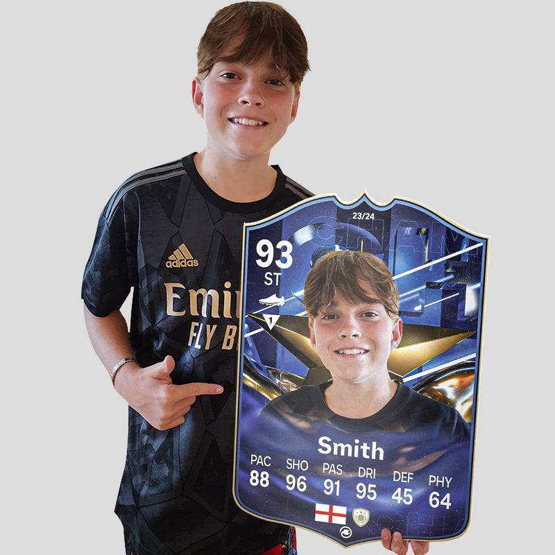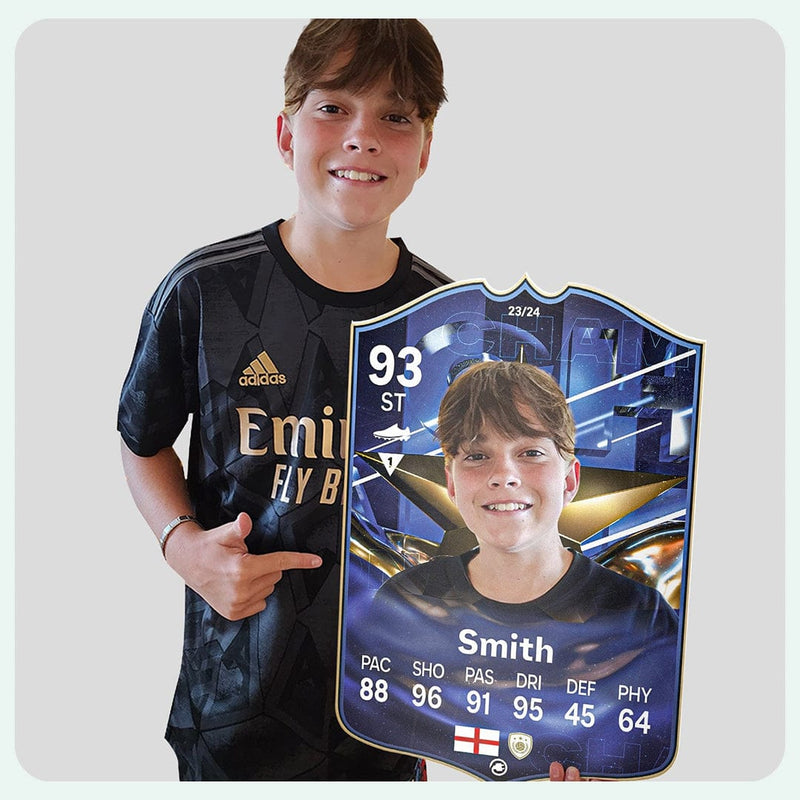 When it comes to personalising your card, the basic steps are to upload a photo and add a name to your card. Then you’ll add details like your player’s position and skill ratings out of 99 for each football skill shown on the card. Our online card builder makes this really easy. And if you aren’t a football card expert, don’t worry!