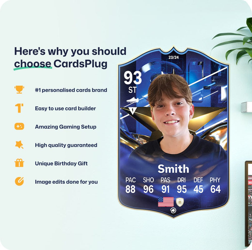 CardsPlug is home to the world’s favourite personalised football cards. Our easy football card builder lets you make a real life football card with your own name, photo, and skill ratings. With 100+ designs to choose from and some inspired by EA SPORTS FC 26 cards seen in EA FC 26, EA FC 25 and FC 24 as well as FIFA cards seen in games like FIFA 23 and FIFA 22.