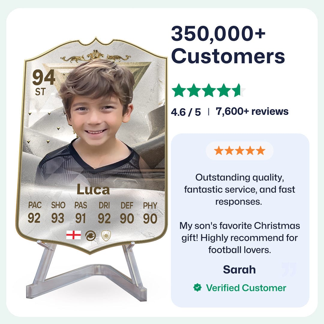 Once you’ve personalised your card, our design experts will edit your photo, design your card, and bring it to life in stunning quality. You’ll get a full preview before we print your card and every card’s quality is backed by our Gold Standard Guarantee. So far, over 350,000+ football fans agree: A CardsPlug football card is the ultimate football gift!