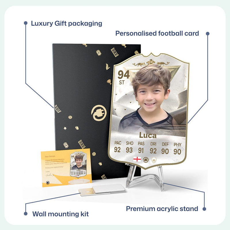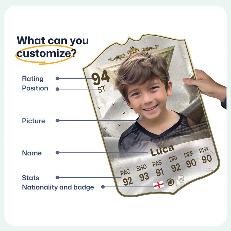 When it comes to personalising your card, the basic steps are to upload a photo and add a name to your card. Then you’ll add details like your player’s position and skill ratings out of 99 for each football skill shown on the card. Our online card builder makes this really easy. And if you aren’t a football card expert, don’t worry!