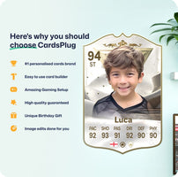 CardsPlug is home to the world’s favourite personalised football cards. Our easy football card builder lets you make a real life football card with your own name, photo, and skill ratings. With 100+ designs to choose from and some inspired by EA SPORTS FC 26 cards seen in EA FC 26, EA FC 25 and FC 24 as well as FIFA cards seen in games like FIFA 23 and FIFA 22.