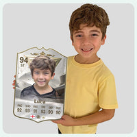 Our football card builder lets you choose between two different card materials. Our Standard cards are made of a ultra-strong variety of Foamex (not cardboard or foam!). This material has a lovely gloss finish and is also super durable. Our world-exclusive Metal football cards have a matte finish and are slightly heavier. Both look amazing and will last forever.