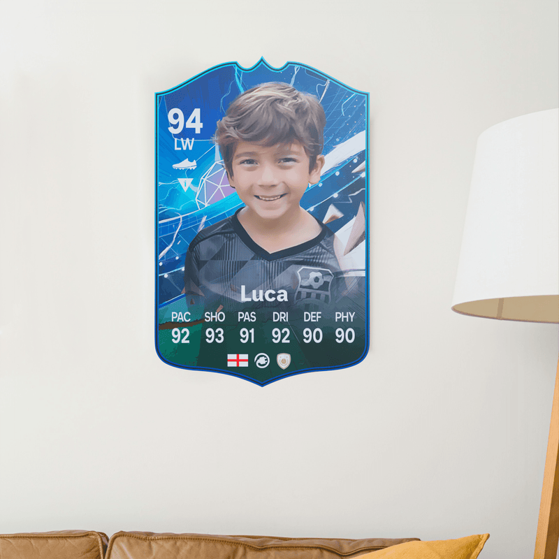 When it comes to personalising your card, the basic steps are to upload a photo and add a name to your card. Then you’ll add details like your player’s position and skill ratings out of 99 for each football skill shown on the card. Our online card builder makes this really easy. And if you aren’t a football card expert, don’t worry!