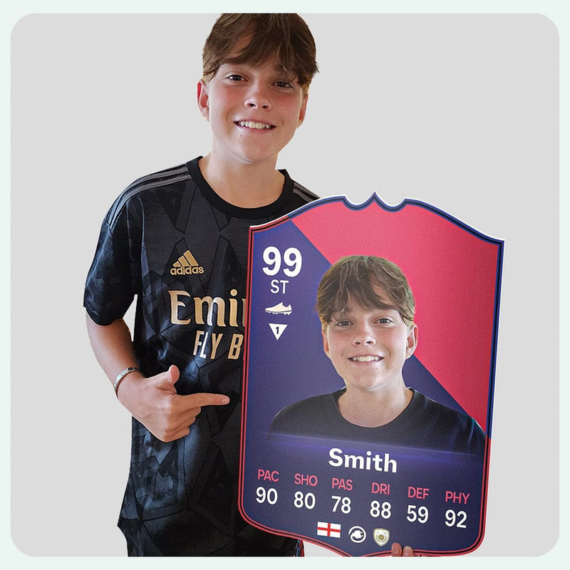 When it comes to personalising your card, the basic steps are to upload a photo and add a name to your card. Then you’ll add details like your player’s position and skill ratings out of 99 for each football skill shown on the card. Our online card builder makes this really easy. And if you aren’t a football card expert, don’t worry!