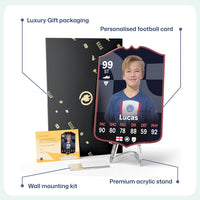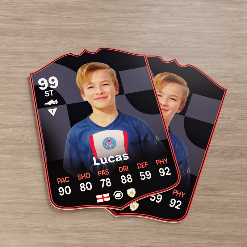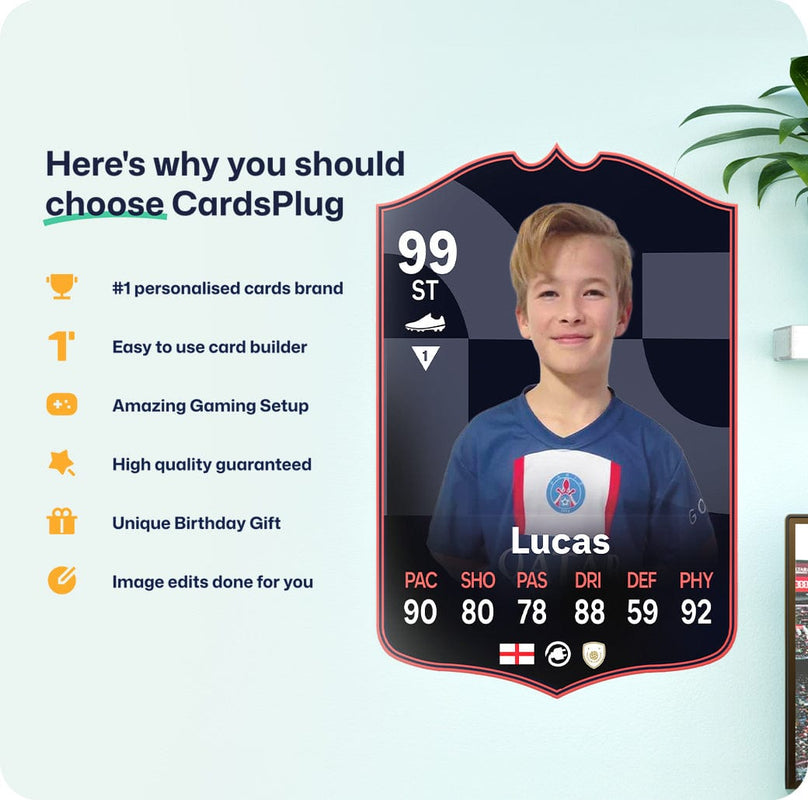 CardsPlug is home to the world’s favourite personalised football cards. Our easy football card builder lets you make a real life football card with your own name, photo, and skill ratings. With 100+ designs to choose from and some inspired by EA SPORTS FC 26 cards seen in EA FC 26, EA FC 25 and FC 24 as well as FIFA cards seen in games like FIFA 23 and FIFA 22.