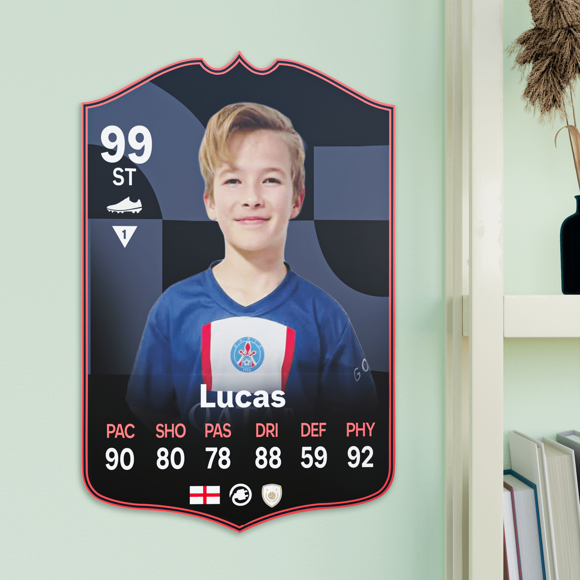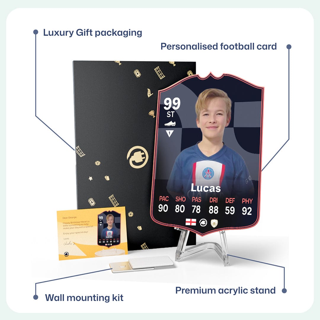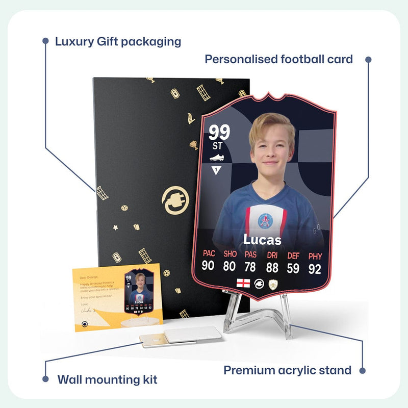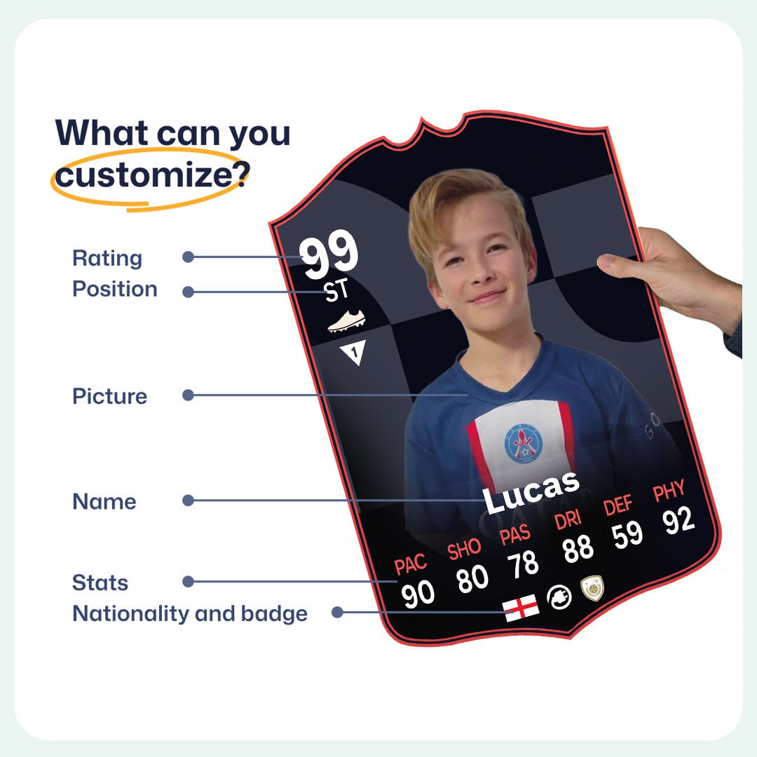 When it comes to personalising your card, the basic steps are to upload a photo and add a name to your card. Then you’ll add details like your player’s position and skill ratings out of 99 for each football skill shown on the card. Our online card builder makes this really easy. And if you aren’t a football card expert, don’t worry!