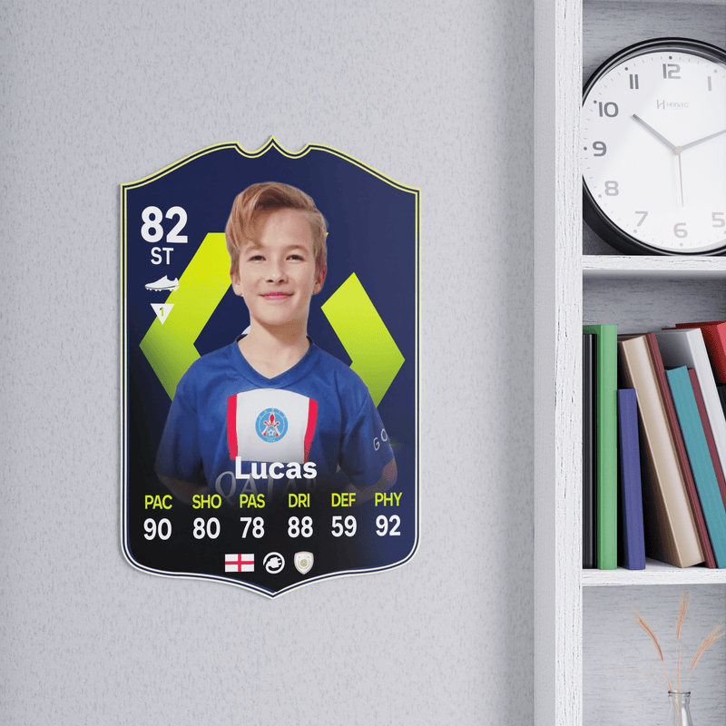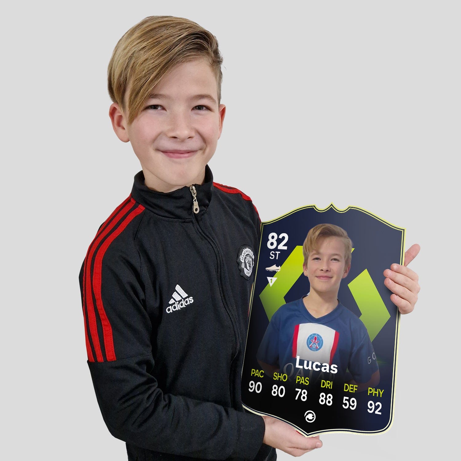 When it comes to personalising your card, the basic steps are to upload a photo and add a name to your card. Then you’ll add details like your player’s position and skill ratings out of 99 for each football skill shown on the card. Our online card builder makes this really easy. And if you aren’t a football card expert, don’t worry!