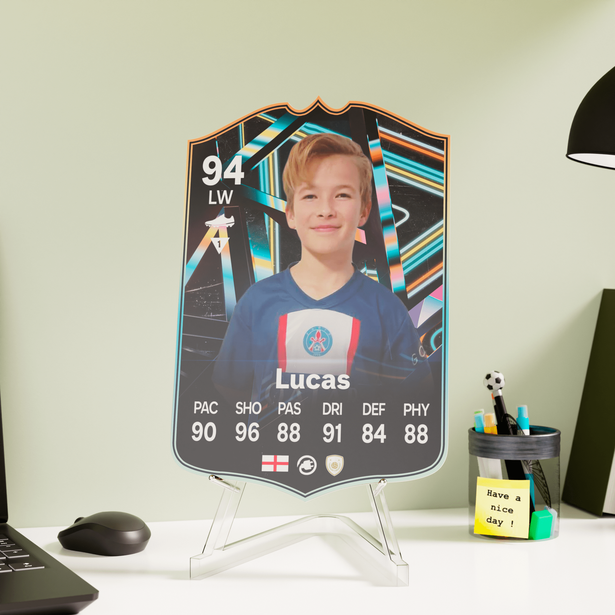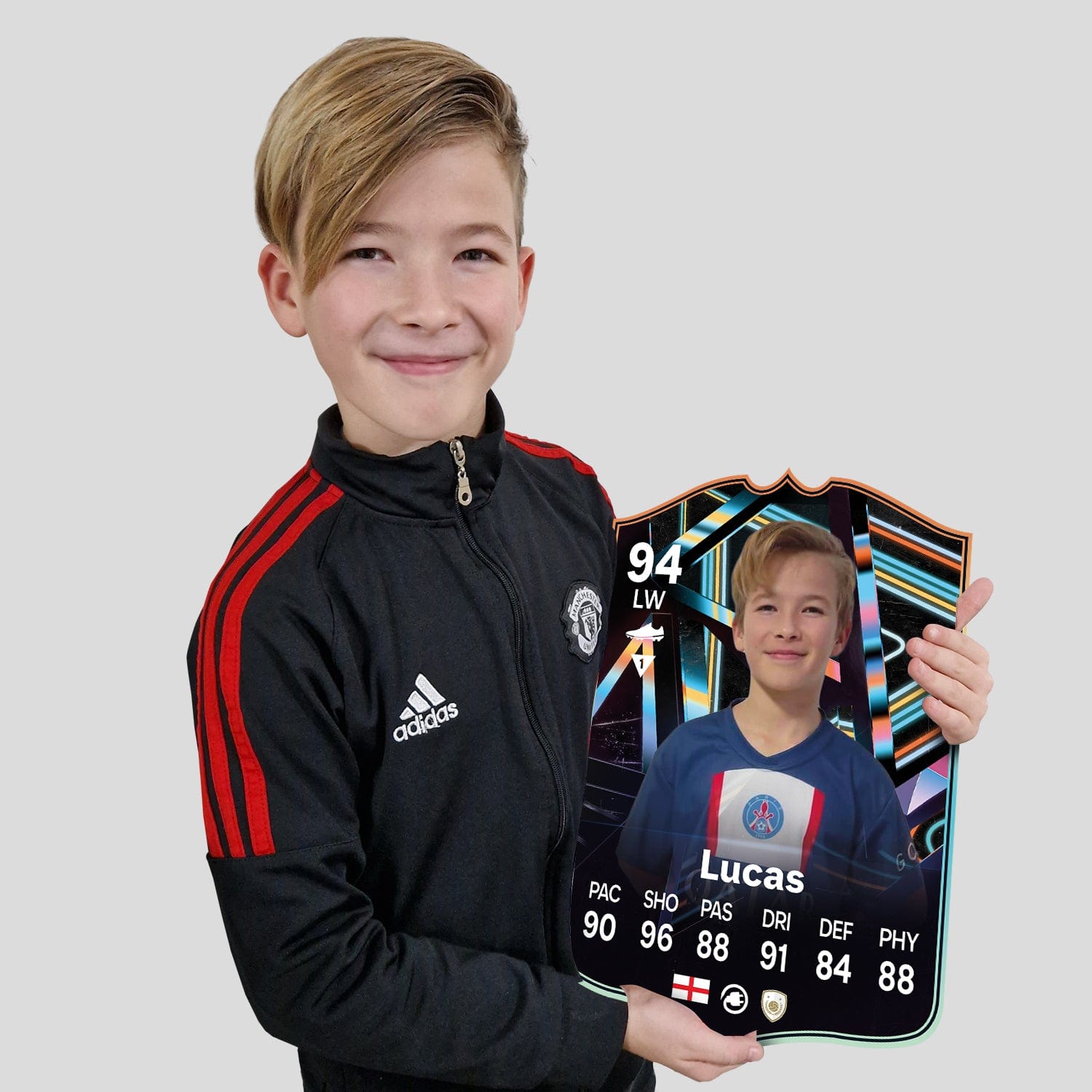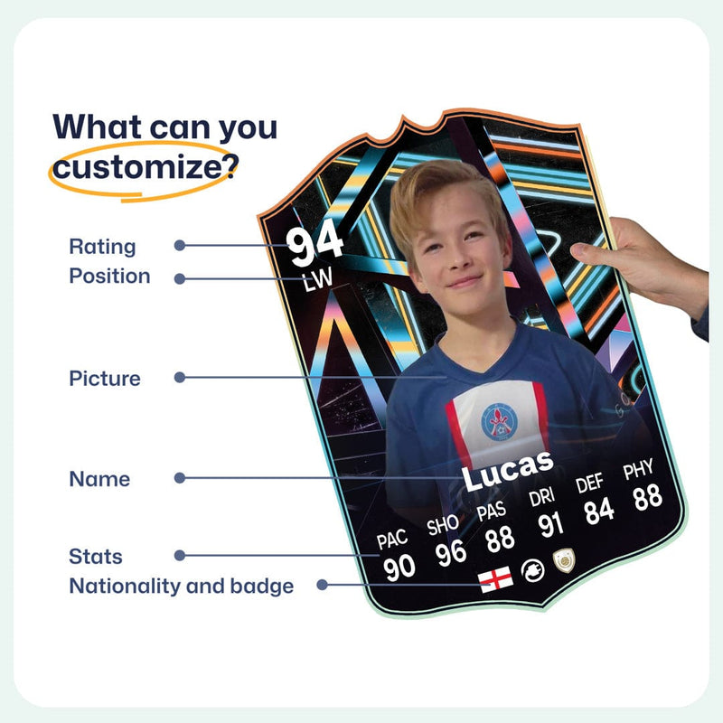 When it comes to personalising your card, the basic steps are to upload a photo and add a name to your card. Then you’ll add details like your player’s position and skill ratings out of 99 for each football skill shown on the card. Our online card builder makes this really easy. And if you aren’t a football card expert, don’t worry!