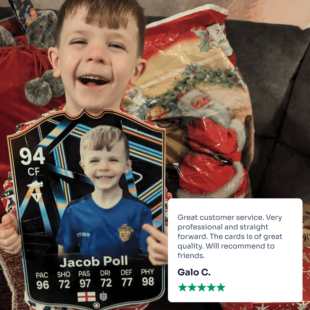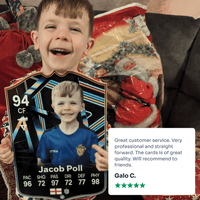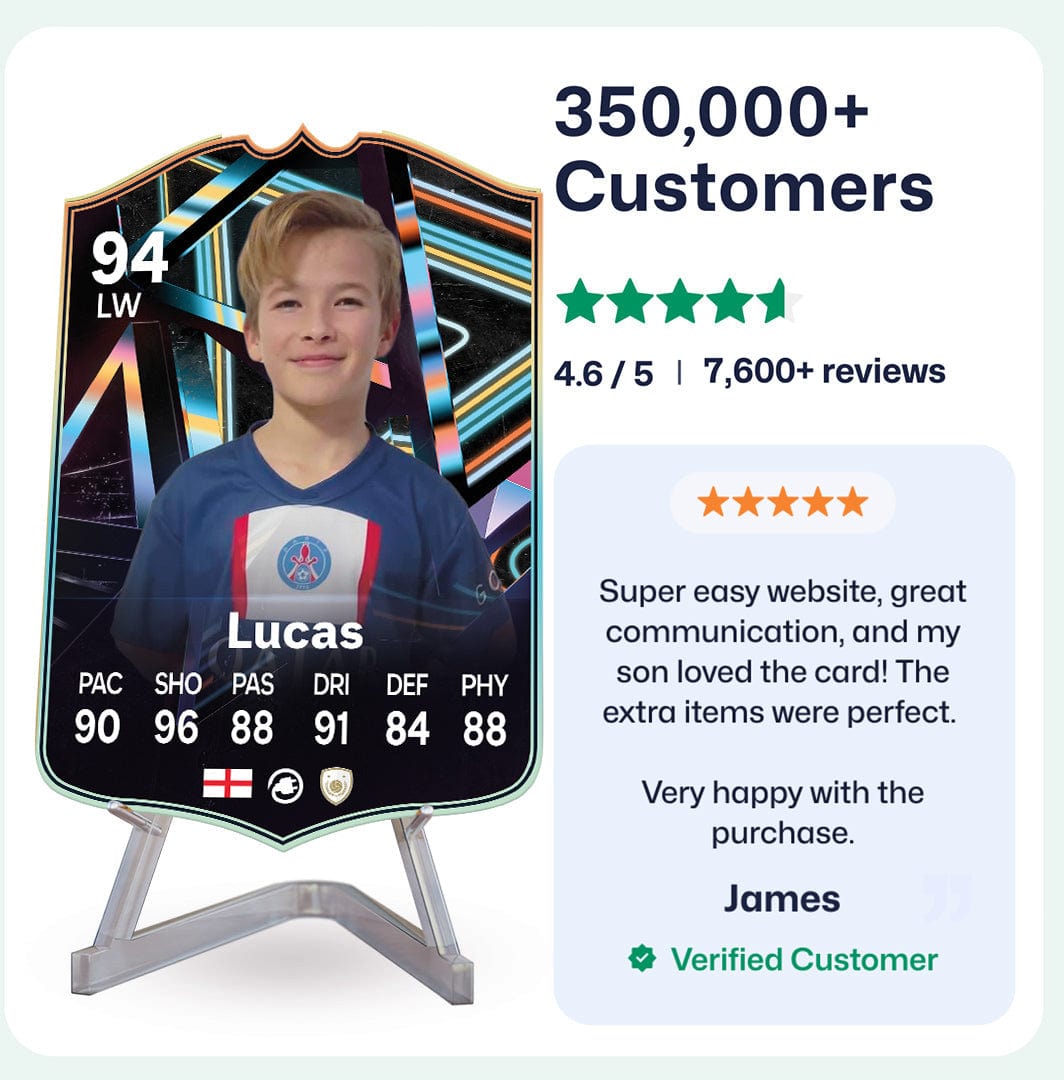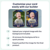 Yes! Our football card designers will remove the background from the photo you upload so it looks just like the football cards you might’ve seen games like EA FC 25, EA FC 24 or FIFA. We’ll also position the photo perfectly on the football card so it looks great. If there are any problems with the quality of your photo, we’ll reach out and let you know. Plus, our website's AI will remove the background on the image for visual purposes before purchase so you can see it without a background on the card.
