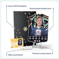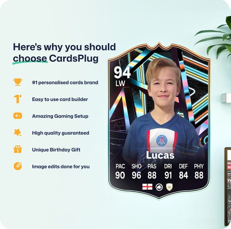 CardsPlug is home to the world’s favourite personalised football cards. Our easy football card builder lets you make a real life football card with your own name, photo, and skill ratings. With 100+ designs to choose from and some inspired by EA SPORTS FC 26 cards seen in EA FC 26, EA FC 25 and FC 24 as well as FIFA cards seen in games like FIFA 23 and FIFA 22.