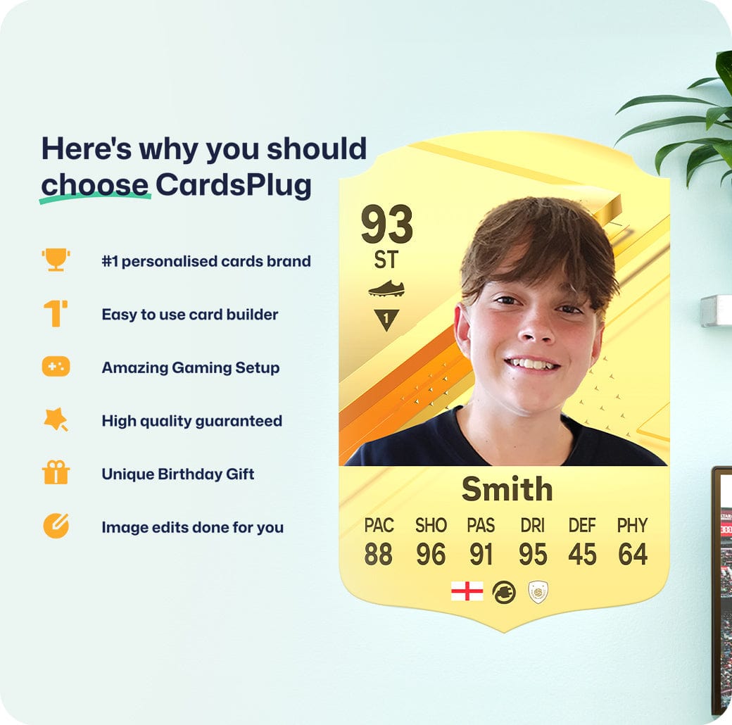 CardsPlug is home to the world’s favourite personalised football cards. Our easy football card builder lets you make a real life football card with your own name, photo, and skill ratings. With 100+ designs to choose from and some inspired by EA SPORTS FC 26 cards seen in EA FC 26, EA FC 25 and FC 24 as well as FIFA cards seen in games like FIFA 23 and FIFA 22.