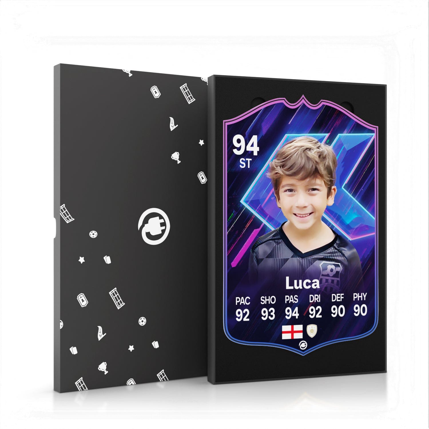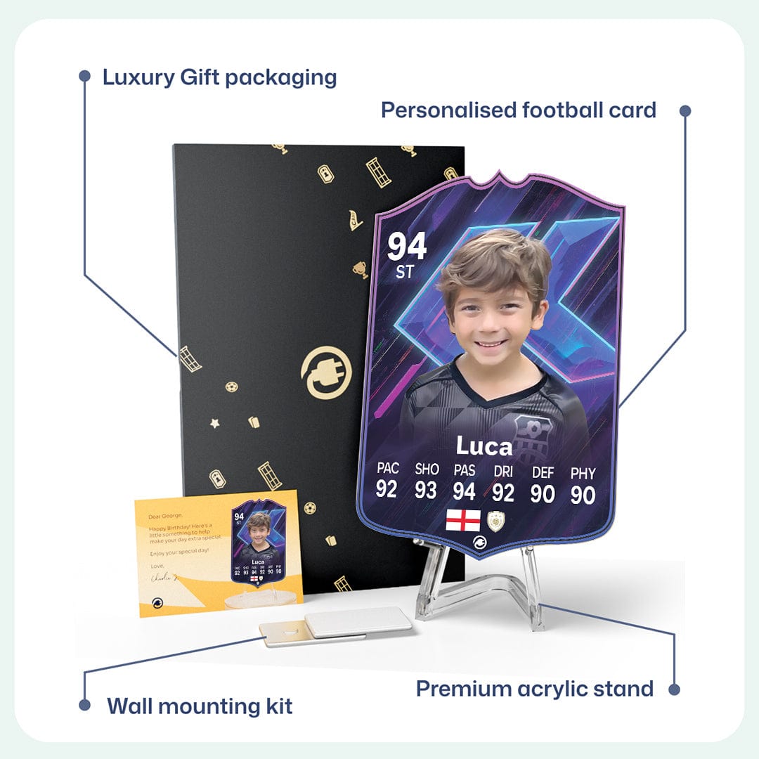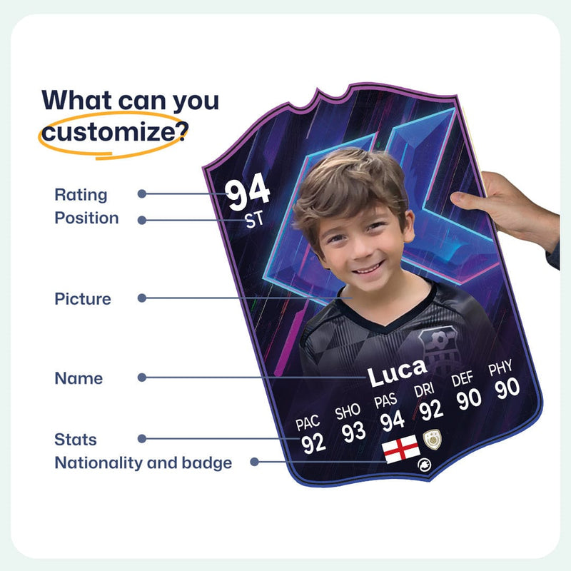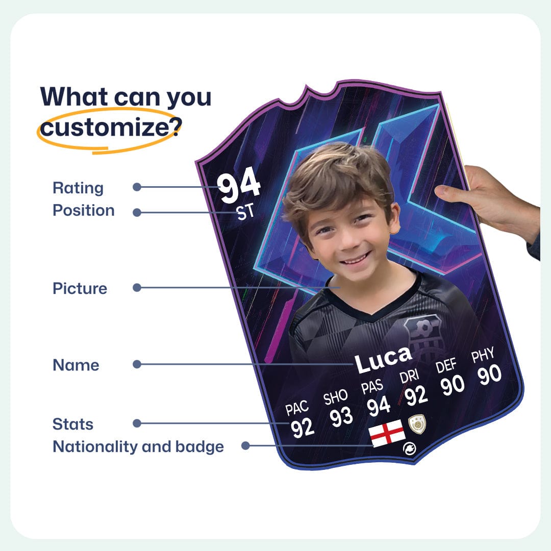 When it comes to personalising your card, the basic steps are to upload a photo and add a name to your card. Then you’ll add details like your player’s position and skill ratings out of 99 for each football skill shown on the card. Our online card builder makes this really easy. And if you aren’t a football card expert, don’t worry!