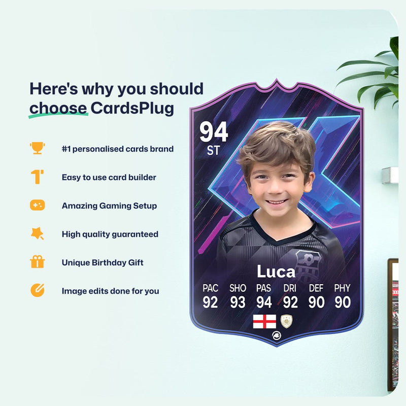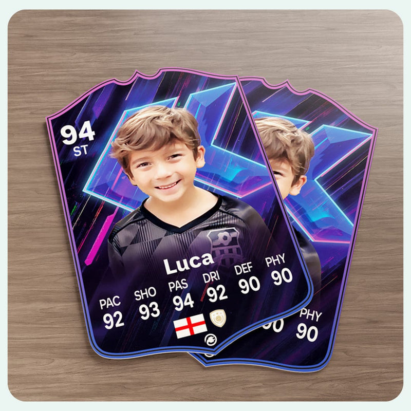 CardsPlug is home to the world’s favourite personalised football cards. Our easy football card builder lets you make a real life football card with your own name, photo, and skill ratings. With 100+ designs to choose from and some inspired by EA SPORTS FC 26 cards seen in EA FC 26, EA FC 25 and FC 24 as well as FIFA cards seen in games like FIFA 23 and FIFA 22.