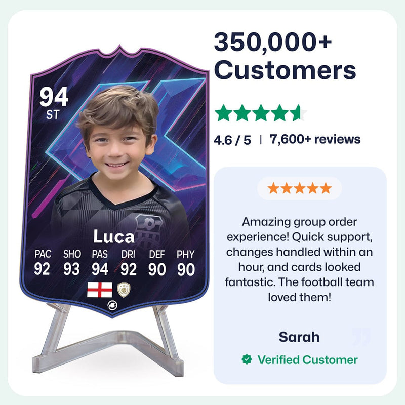 Yes! Our football card designers will remove the background from the photo you upload so it looks just like the football cards you might’ve seen games like EA FC 25, EA FC 24 or FIFA. We’ll also position the photo perfectly on the football card so it looks great. If there are any problems with the quality of your photo, we’ll reach out and let you know. Plus, our website's AI will remove the background on the image for visual purposes before purchase so you can see it without a background on the card.