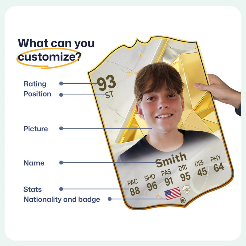 When it comes to personalising your card, the basic steps are to upload a photo and add a name to your card. Then you’ll add details like your player’s position and skill ratings out of 99 for each football skill shown on the card. Our online card builder makes this really easy. And if you aren’t a football card expert, don’t worry!