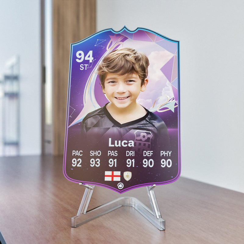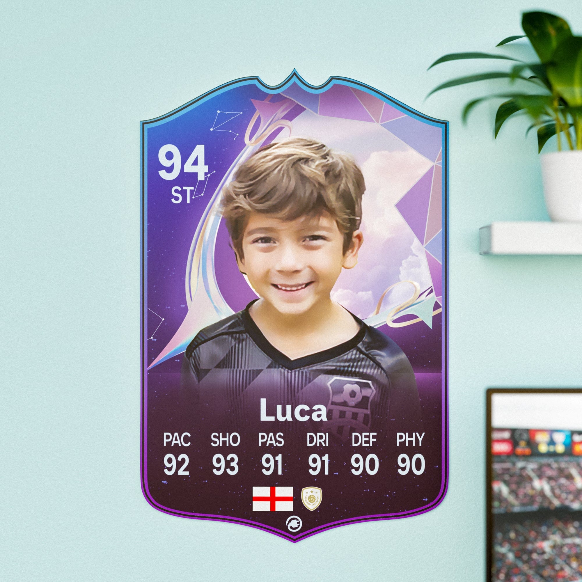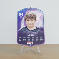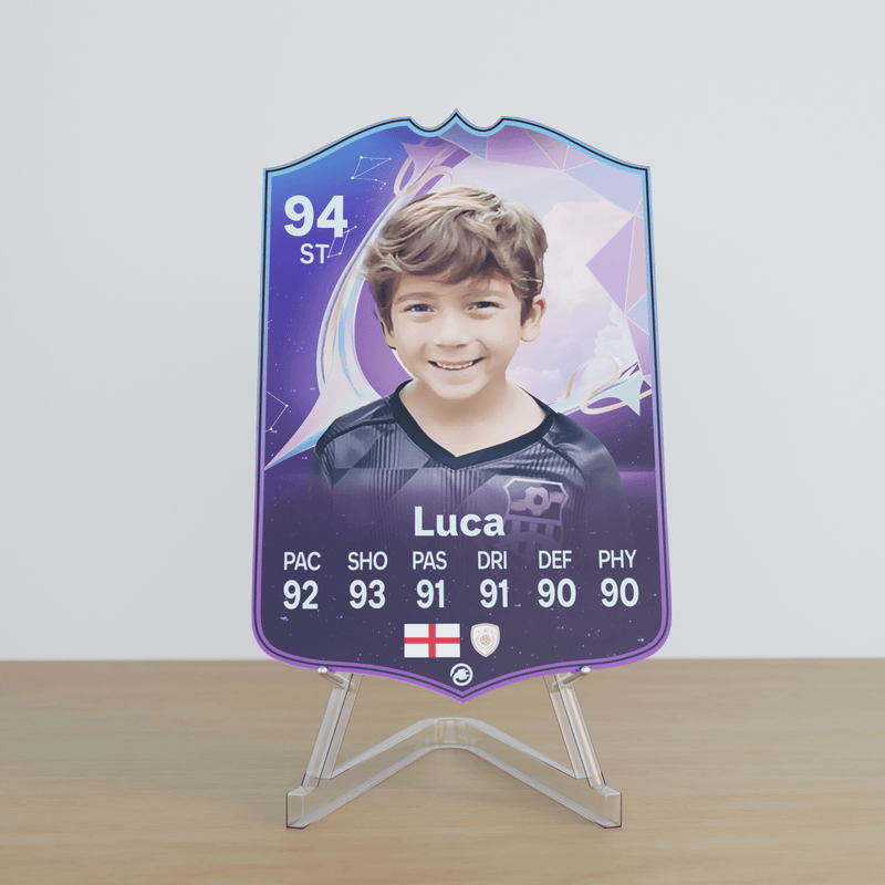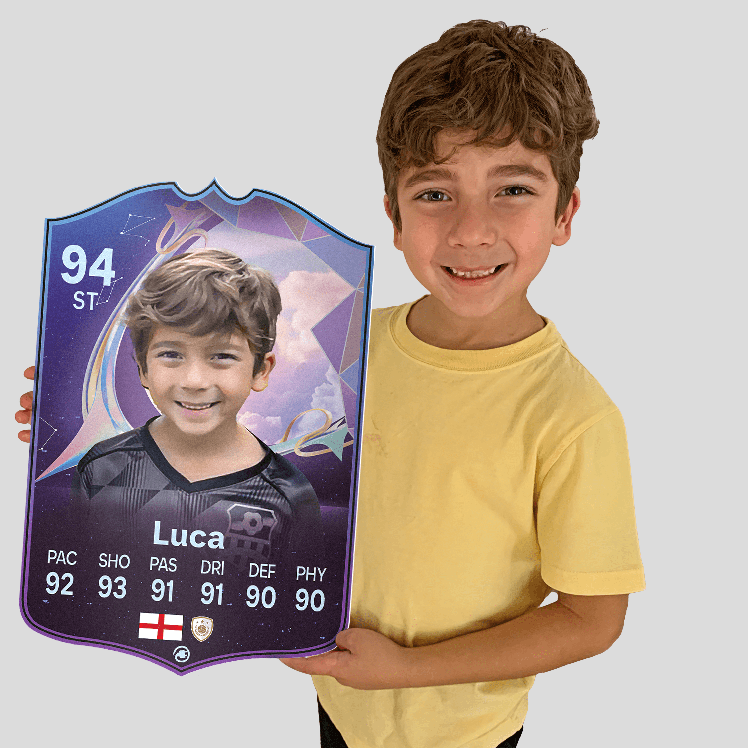 When it comes to personalising your card, the basic steps are to upload a photo and add a name to your card. Then you’ll add details like your player’s position and skill ratings out of 99 for each football skill shown on the card. Our online card builder makes this really easy. And if you aren’t a football card expert, don’t worry!