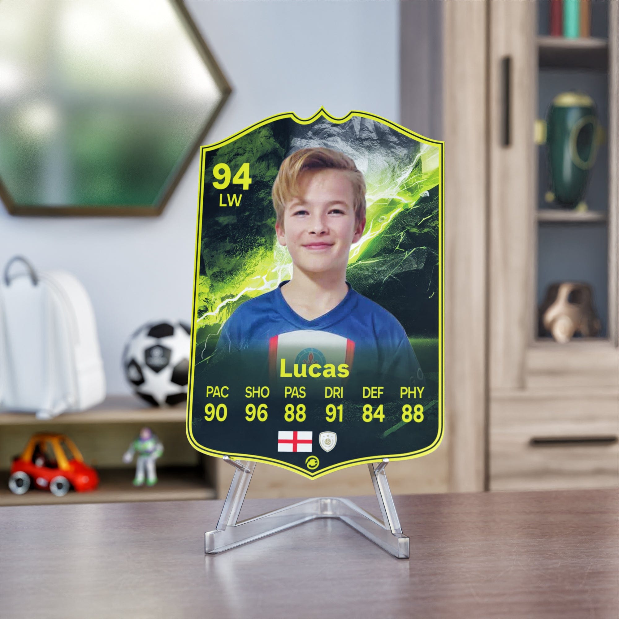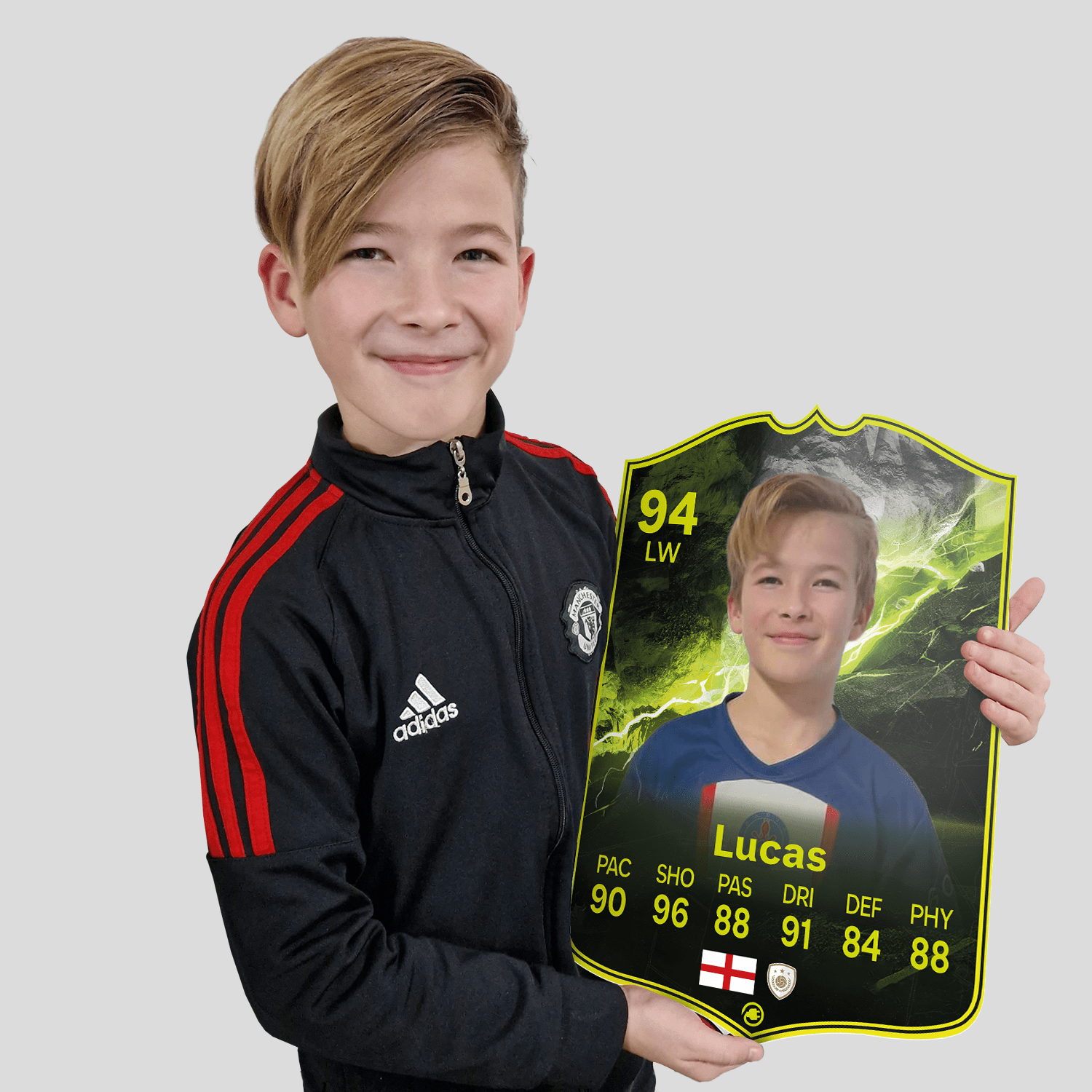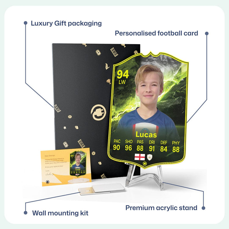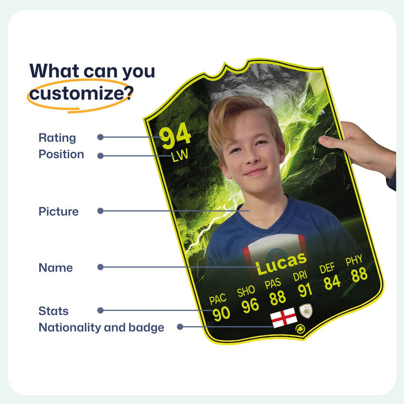 When it comes to personalising your card, the basic steps are to upload a photo and add a name to your card. Then you’ll add details like your player’s position and skill ratings out of 99 for each football skill shown on the card. Our online card builder makes this really easy. And if you aren’t a football card expert, don’t worry!