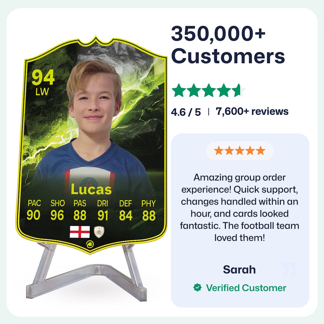 Yes! Our football card designers will remove the background from the photo you upload so it looks just like the football cards you might’ve seen games like EA FC 25, EA FC 24 or FIFA. We’ll also position the photo perfectly on the football card so it looks great. If there are any problems with the quality of your photo, we’ll reach out and let you know. Plus, our website's AI will remove the background on the image for visual purposes before purchase so you can see it without a background on the card.