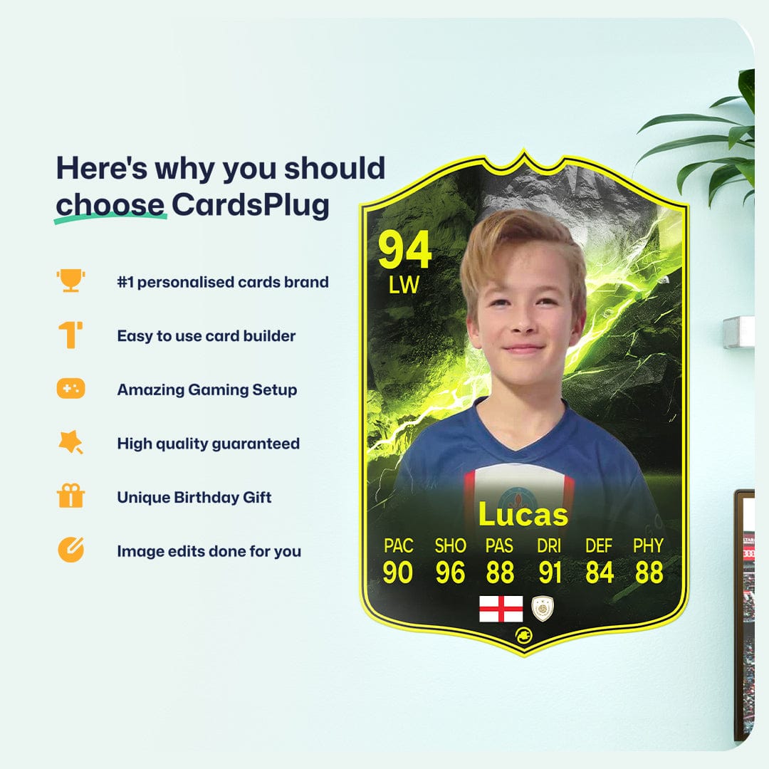 CardsPlug is home to the world’s favourite personalised football cards. Our easy football card builder lets you make a real life football card with your own name, photo, and skill ratings. With 100+ designs to choose from and some inspired by EA SPORTS FC 26 cards seen in EA FC 26, EA FC 25 and FC 24 as well as FIFA cards seen in games like FIFA 23 and FIFA 22.