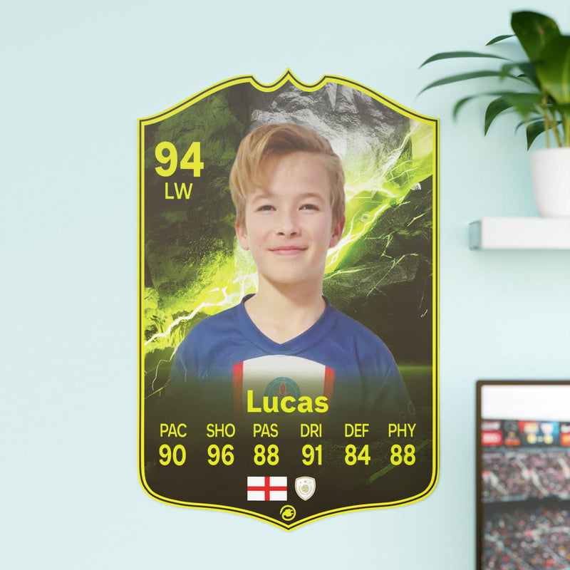 Our football card builder lets you choose between two different card materials. Our Standard cards are made of a ultra-strong variety of Foamex (not cardboard or foam!). This material has a lovely gloss finish and is also super durable. Our world-exclusive Metal football cards have a matte finish and are slightly heavier. Both look amazing and will last forever.