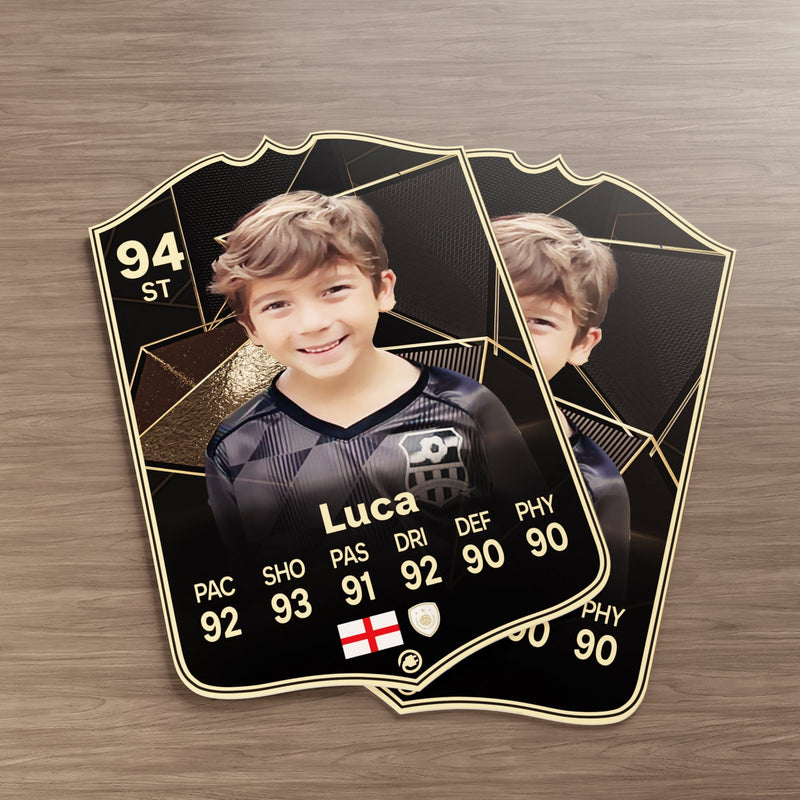 When it comes to personalising your card, the basic steps are to upload a photo and add a name to your card. Then you’ll add details like your player’s position and skill ratings out of 99 for each football skill shown on the card. Our online card builder makes this really easy. And if you aren’t a football card expert, don’t worry!