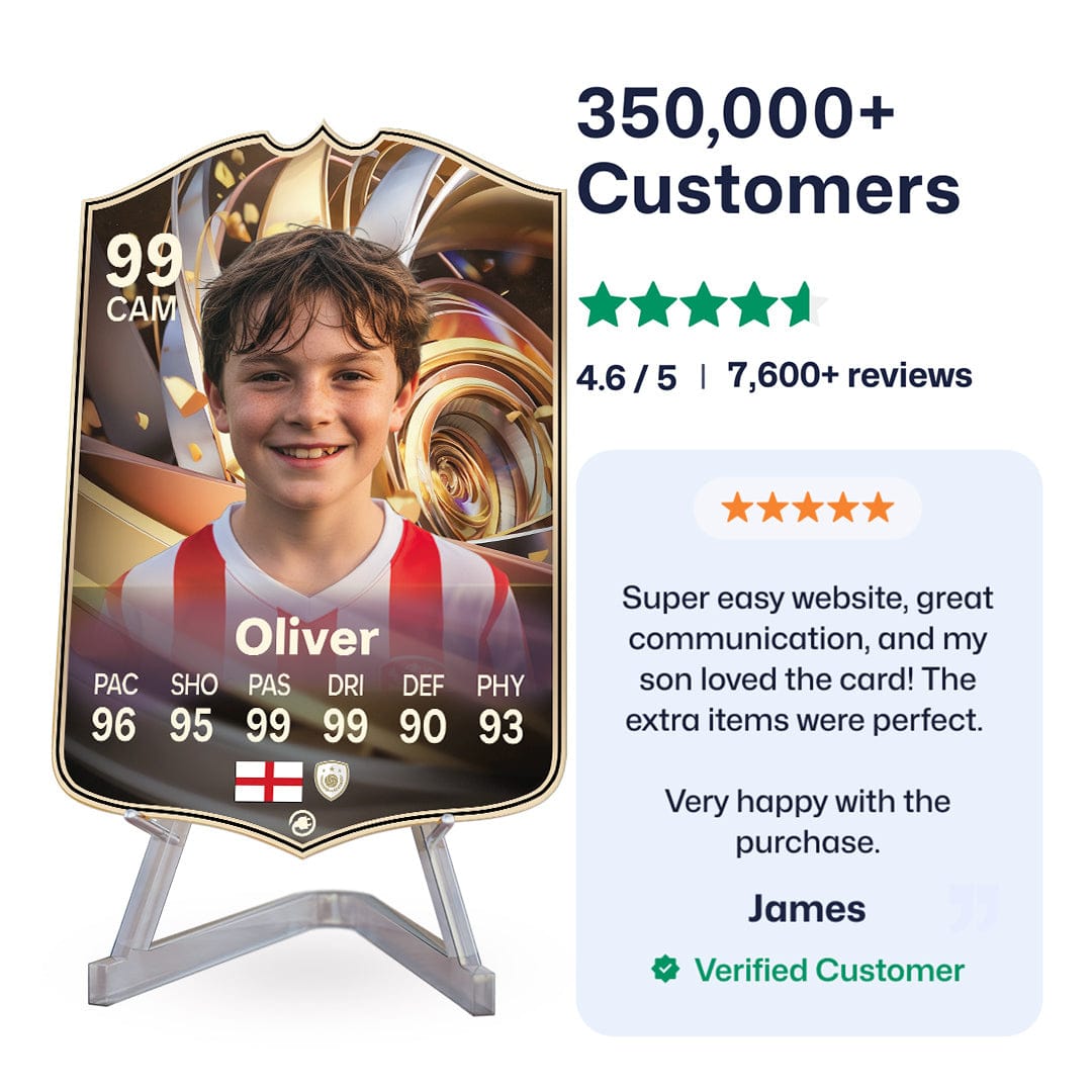 Once you’ve personalised your card, our design experts will edit your photo, design your card, and bring it to life in stunning quality. You’ll get a full preview before we print your card and every card’s quality is backed by our Gold Standard Guarantee. So far, over 350,000+ football fans agree: A CardsPlug football card is the ultimate football gift!