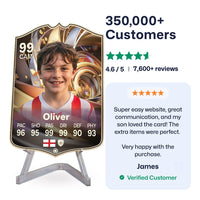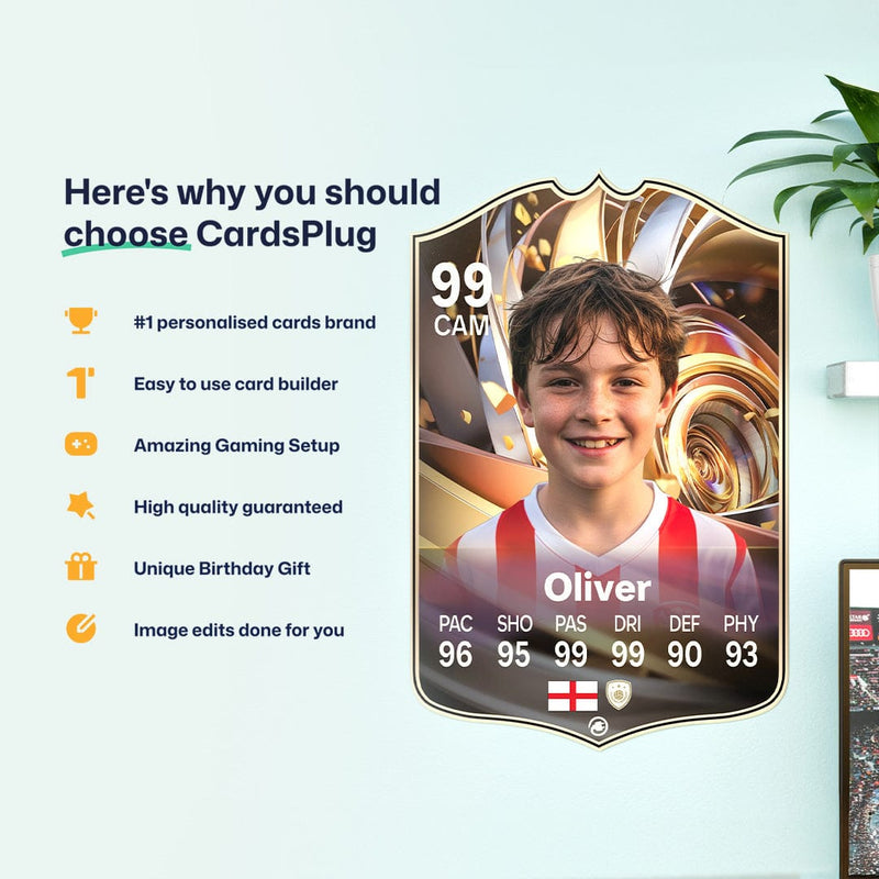 CardsPlug is home to the world’s favourite personalised football cards. Our easy football card builder lets you make a real life football card with your own name, photo, and skill ratings. With 100+ designs to choose from and some inspired by EA SPORTS FC 26 cards seen in EA FC 26, EA FC 25 and FC 24 as well as FIFA cards seen in games like FIFA 23 and FIFA 22.