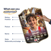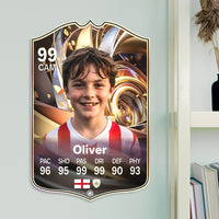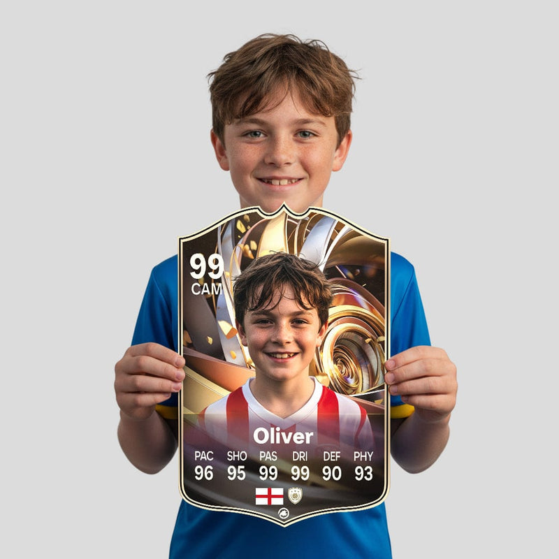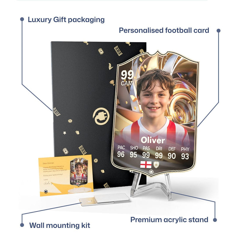 When it comes to personalising your card, the basic steps are to upload a photo and add a name to your card. Then you’ll add details like your player’s position and skill ratings out of 99 for each football skill shown on the card. Our online card builder makes this really easy. And if you aren’t a football card expert, don’t worry!