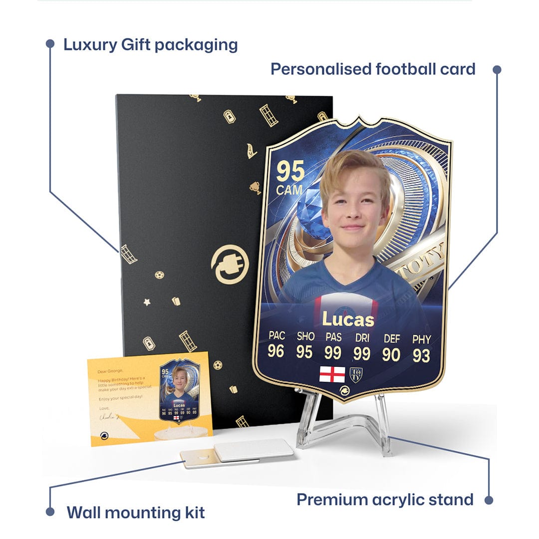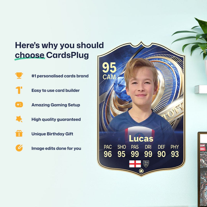 CardsPlug is home to the world’s favourite personalised football cards. Our easy football card builder lets you make a real life football card with your own name, photo, and skill ratings. With 100+ designs to choose from and some inspired by EA SPORTS FC 26 cards seen in EA FC 26, EA FC 25 and FC 24 as well as FIFA cards seen in games like FIFA 23 and FIFA 22.