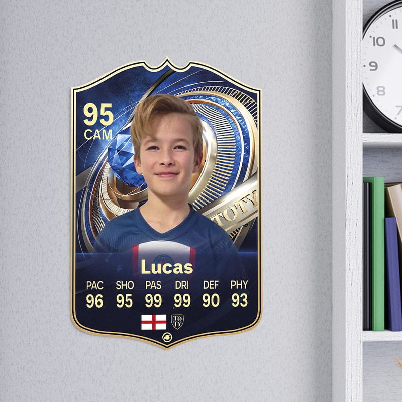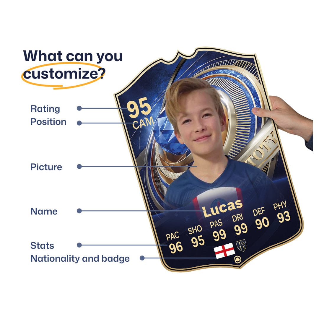 When it comes to personalising your card, the basic steps are to upload a photo and add a name to your card. Then you’ll add details like your player’s position and skill ratings out of 99 for each football skill shown on the card. Our online card builder makes this really easy. And if you aren’t a football card expert, don’t worry!