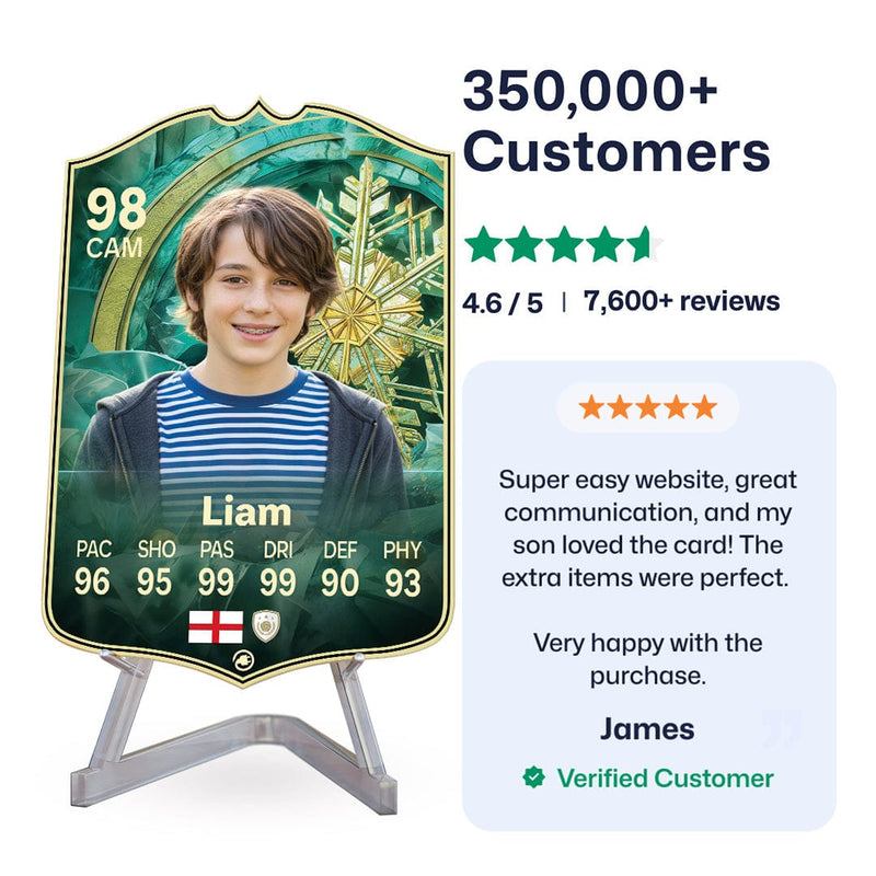 Yes! Our football card designers will remove the background from the photo you upload so it looks just like the football cards you might’ve seen games like EA FC 25, EA FC 24 or FIFA. We’ll also position the photo perfectly on the football card so it looks great. If there are any problems with the quality of your photo, we’ll reach out and let you know. Plus, our website's AI will remove the background on the image for visual purposes before purchase so you can see it without a background on the card.