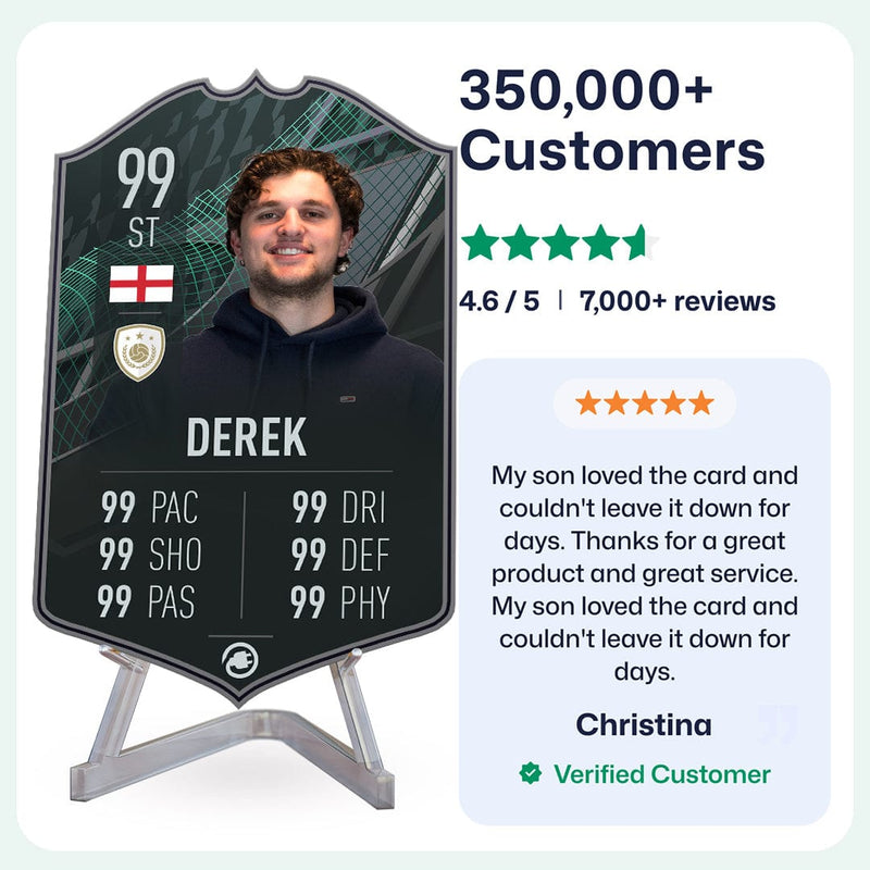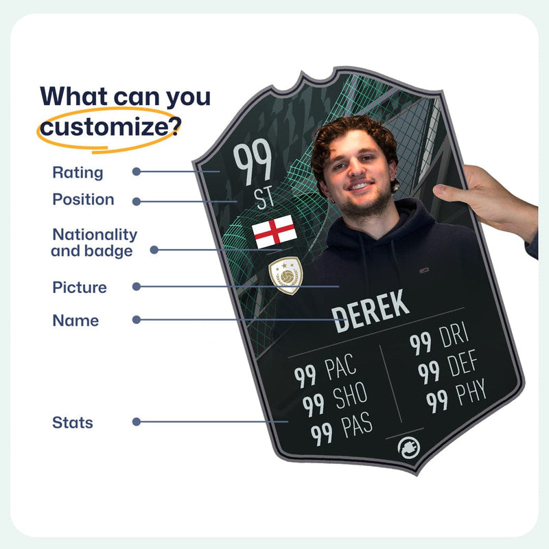 When it comes to personalising your card, the basic steps are to upload a photo and add a name to your card. Then you’ll add details like your player’s position and skill ratings out of 99 for each football skill shown on the card. Our online card builder makes this really easy. And if you aren’t a football card expert, don’t worry!