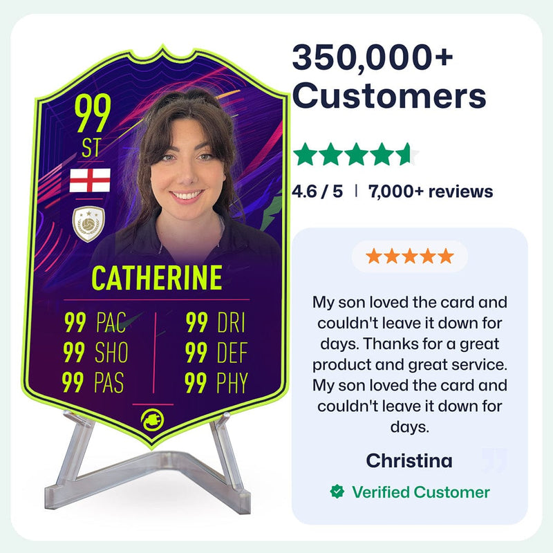 Once you’ve personalised your card, our design experts will edit your photo, design your card, and bring it to life in stunning quality. You’ll get a full preview before we print your card and every card’s quality is backed by our Gold Standard Guarantee. So far, over 350,000+ football fans agree: A CardsPlug football card is the ultimate football gift!
