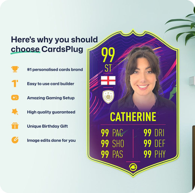 CardsPlug is home to the world’s favourite personalised football cards. Our easy football card builder lets you make a real life football card with your own name, photo, and skill ratings. With 100+ designs to choose from and some inspired by EA SPORTS FC 26 cards seen in EA FC 26, EA FC 25 and FC 24 as well as FIFA cards seen in games like FIFA 23 and FIFA 22.