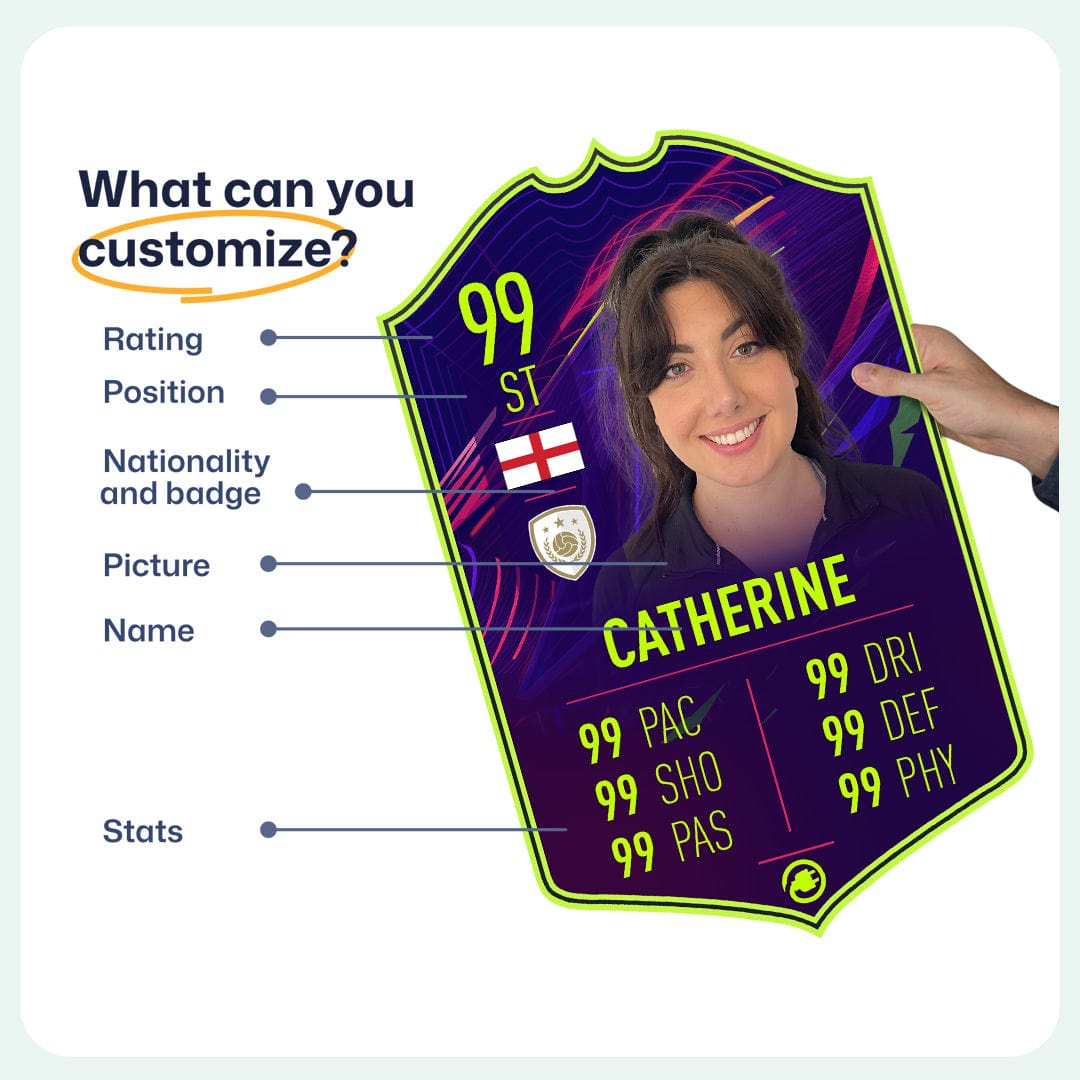 When it comes to personalising your card, the basic steps are to upload a photo and add a name to your card. Then you’ll add details like your player’s position and skill ratings out of 99 for each football skill shown on the card. Our online card builder makes this really easy. And if you aren’t a football card expert, don’t worry!