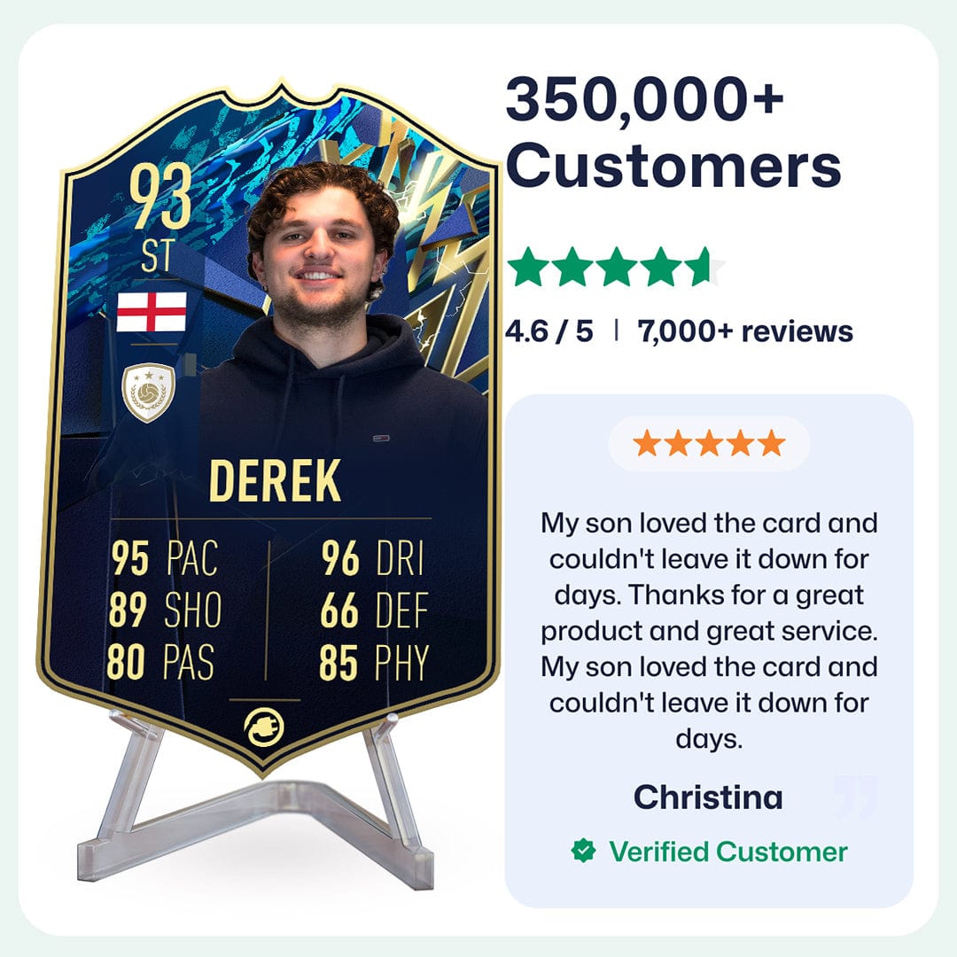Once you’ve personalised your card, our design experts will edit your photo, design your card, and bring it to life in stunning quality. You’ll get a full preview before we print your card and every card’s quality is backed by our Gold Standard Guarantee. So far, over 350,000+ football fans agree: A CardsPlug football card is the ultimate football gift!