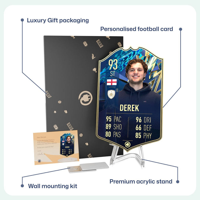 When it comes to personalising your card, the basic steps are to upload a photo and add a name to your card. Then you’ll add details like your player’s position and skill ratings out of 99 for each football skill shown on the card. Our online card builder makes this really easy. And if you aren’t a football card expert, don’t worry!