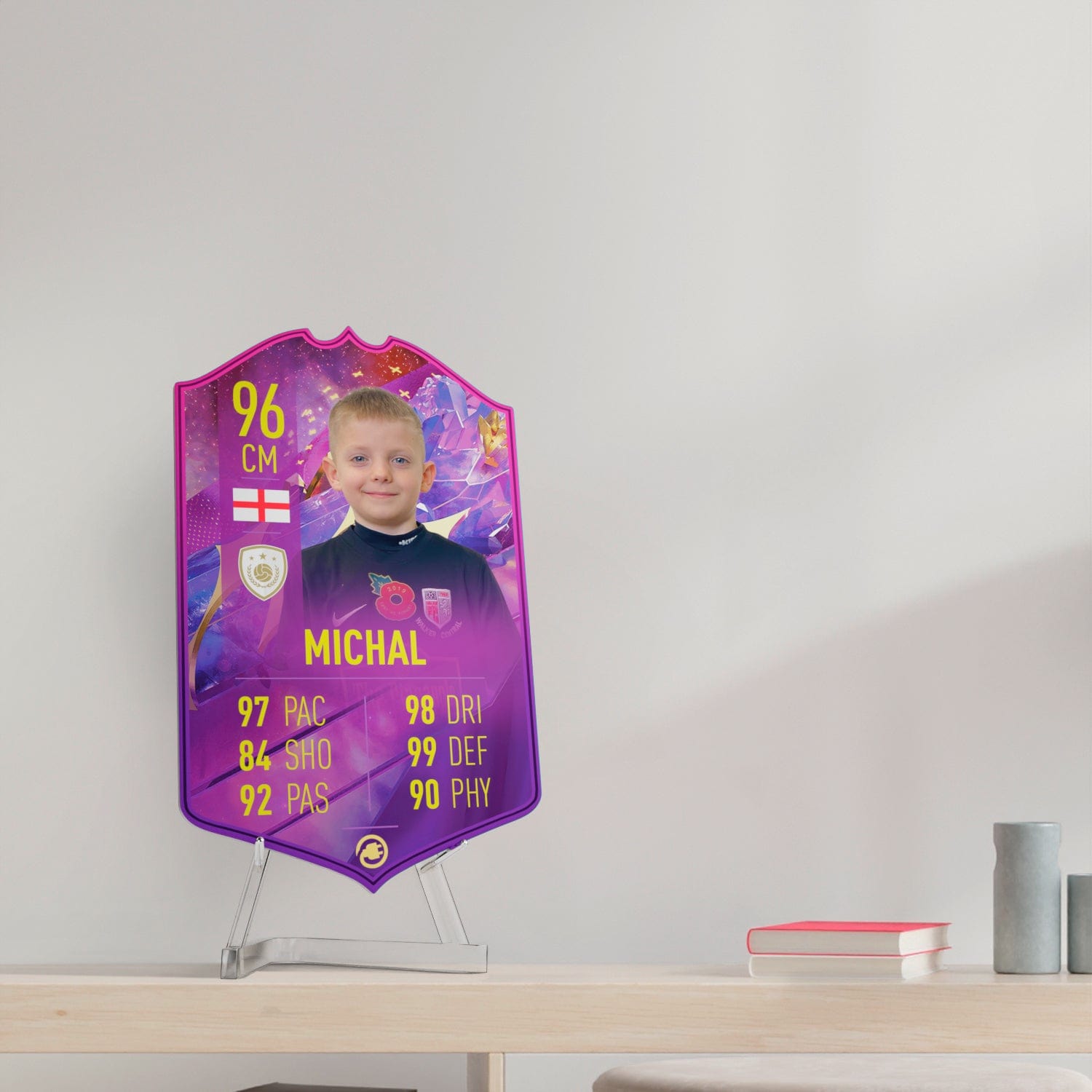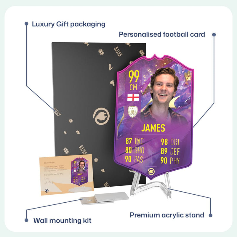 When it comes to personalising your card, the basic steps are to upload a photo and add a name to your card. Then you’ll add details like your player’s position and skill ratings out of 99 for each football skill shown on the card. Our online card builder makes this really easy. And if you aren’t a football card expert, don’t worry!