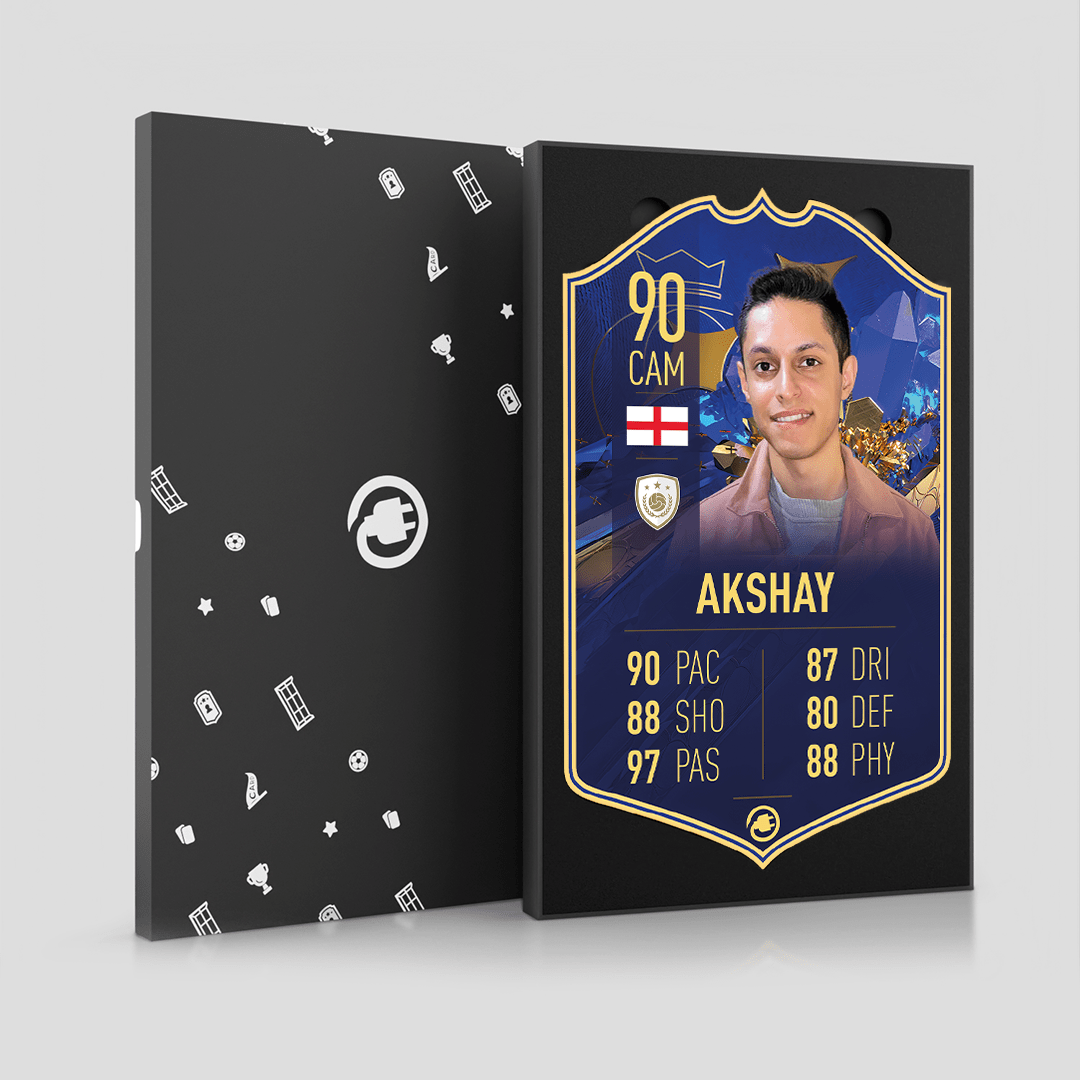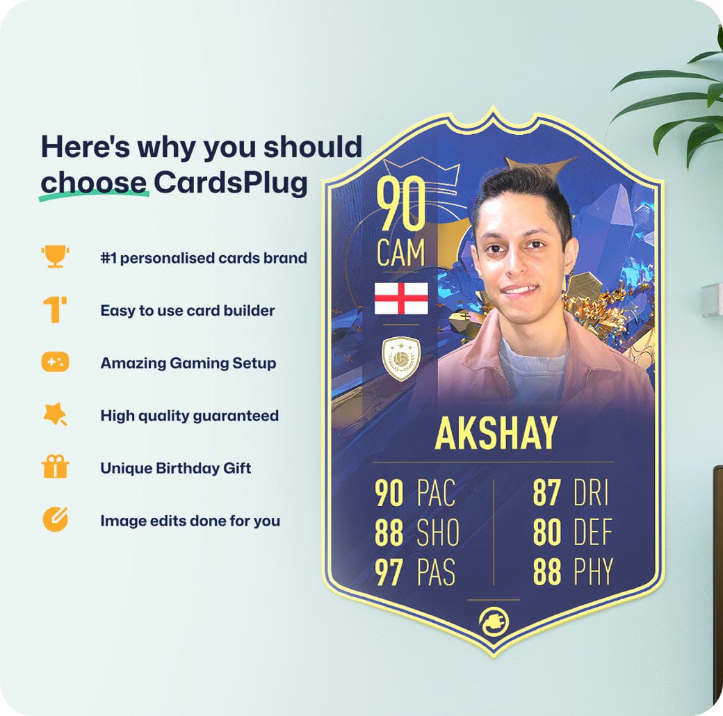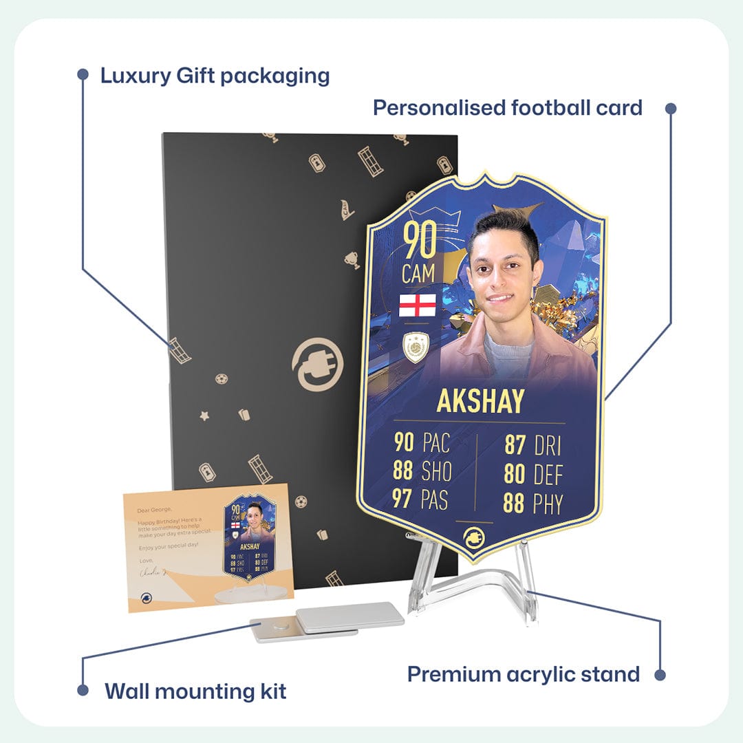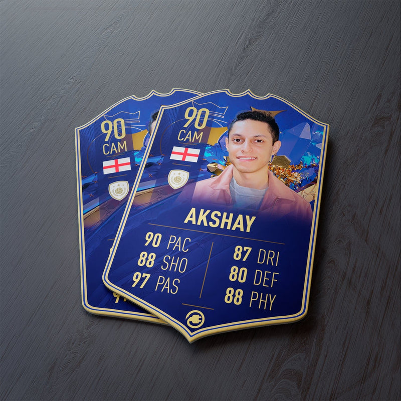 CardsPlug is home to the world’s favourite personalised football cards. Our easy football card builder lets you make a real life football card with your own name, photo, and skill ratings. With 100+ designs to choose from and some inspired by EA SPORTS FC 26 cards seen in EA FC 26, EA FC 25 and FC 24 as well as FIFA cards seen in games like FIFA 23 and FIFA 22.