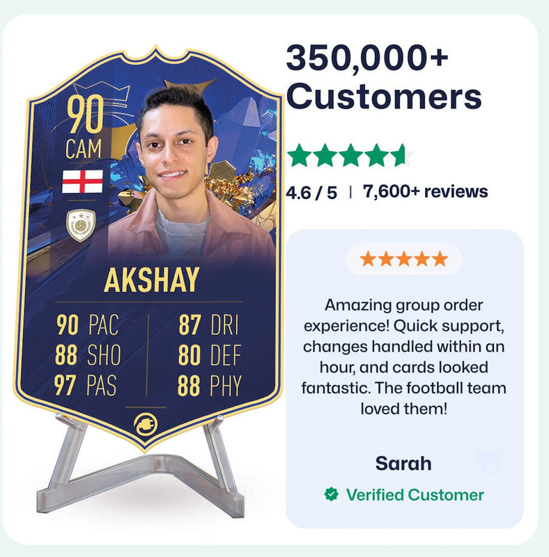 Yes! Our football card designers will remove the background from the photo you upload so it looks just like the football cards you might’ve seen games like EA FC 25, EA FC 24 or FIFA. We’ll also position the photo perfectly on the football card so it looks great. If there are any problems with the quality of your photo, we’ll reach out and let you know. Plus, our website's AI will remove the background on the image for visual purposes before purchase so you can see it without a background on the card.