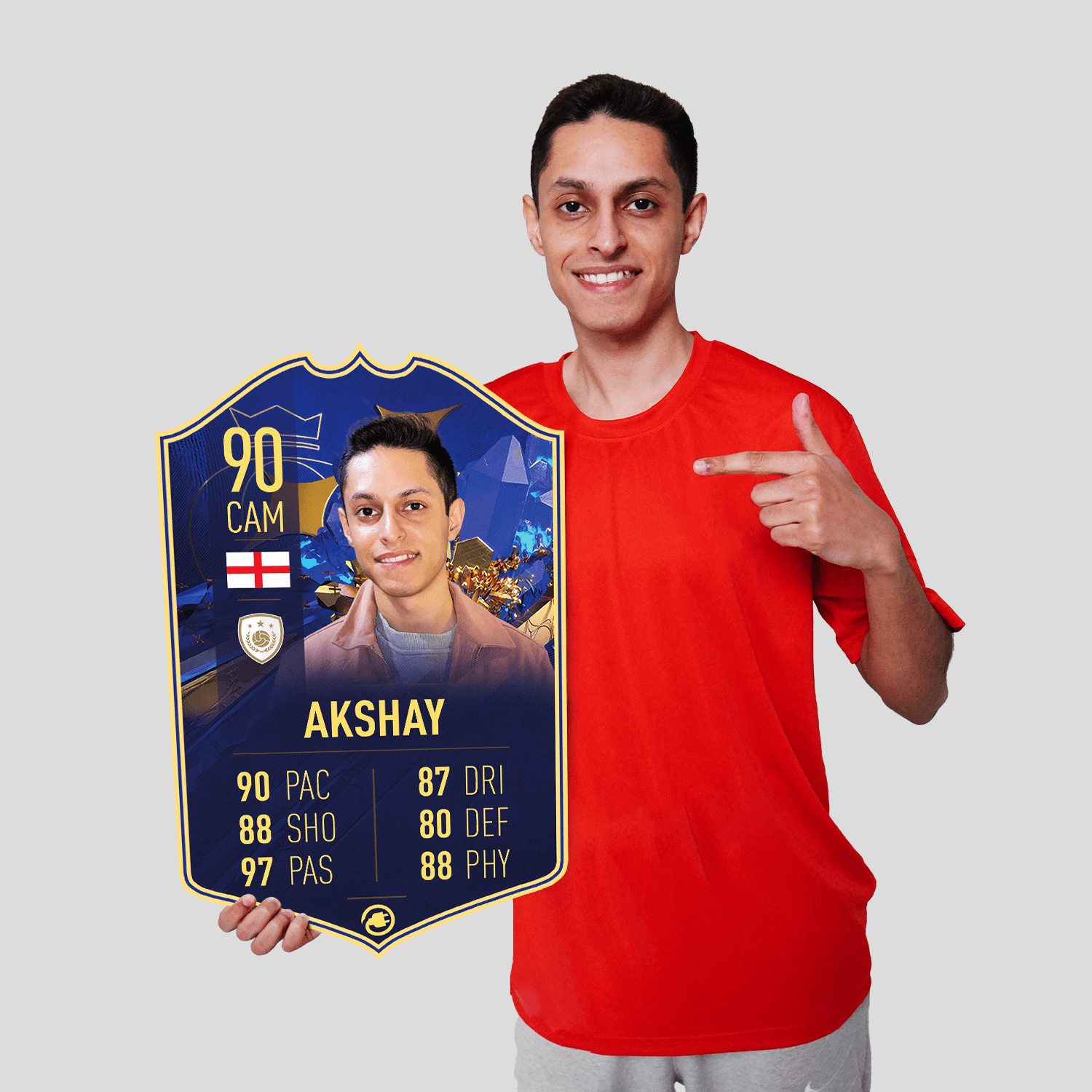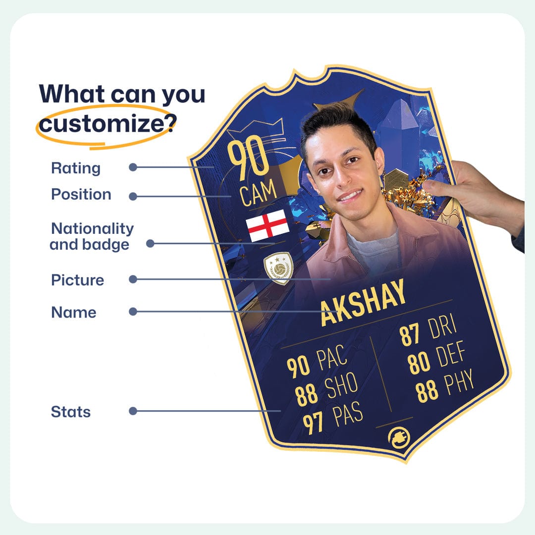 When it comes to personalising your card, the basic steps are to upload a photo and add a name to your card. Then you’ll add details like your player’s position and skill ratings out of 99 for each football skill shown on the card. Our online card builder makes this really easy. And if you aren’t a football card expert, don’t worry!